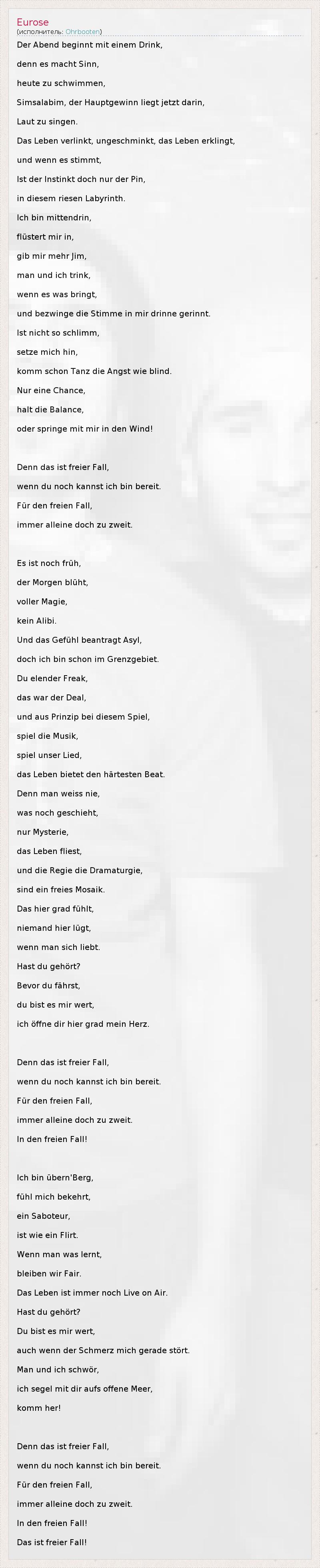 Der Abend beginnt mit einem Drink, denn es macht Sinn, heute zu schwimmen, Simsalabim, der Hauptgewinn liegt jetzt darin, Laut zu singen. Das Leben verlinkt, ungeschminkt, das Leben erklingt, und wenn es stimmt, Ist der Instinkt doch nur der Pin, in diesem riesen Labyrinth. Ich bin mittendrin, flüstert mir in, gib mir mehr Jim, man und ich trink, wenn es was bringt, und bezwinge die Stimme in mir drinne gerinnt. Ist nicht so schlimm, setze mich hin, komm schon Tanz die Angst wie blind. Nur eine Chance, halt die Balance, oder springe mit mir in den Wind! Denn das ist freier Fall, wenn du noch kannst ich bin bereit. Für den freien Fall, immer alleine doch zu zweit. Es ist noch früh, der Morgen blüht, voller Magie, kein Alibi. Und das Gefühl beantragt Asyl, doch ich bin schon im Grenzgebiet. Du elender Freak, das war der Deal, und aus Prinzip bei diesem Spiel, spiel die Musik, spiel unser Lied, das Leben bietet den härtesten Beat. Denn man weiss nie, was noch geschieht, nur Mysterie, das Leben fliest, und die Regie die Dramaturgie, sind ein freies Mosaik. Das hier grad fühlt, niemand hier lügt, wenn man sich liebt. Hast du gehört? Bevor du fährst, du bist es mir wert, ich öffne dir hier grad mein Herz. Denn das ist freier Fall, wenn du noch kannst ich bin bereit. Für den freien Fall, immer alleine doch zu zweit. In den freien Fall! Ich bin übern'Berg, fühl mich bekehrt, ein Saboteur, ist wie ein Flirt. Wenn man was lernt, bleiben wir Fair. Das Leben ist immer noch Live on Air. Hast du gehört? Du bist es mir wert, auch wenn der Schmerz mich gerade stört. Man und ich schwör, ich segel mit dir aufs offene Meer, komm her! Denn das ist freier Fall, wenn du noch kannst ich bin bereit. Für den freien Fall, immer alleine doch zu zweit. In den freien Fall! Das ist freier Fall!