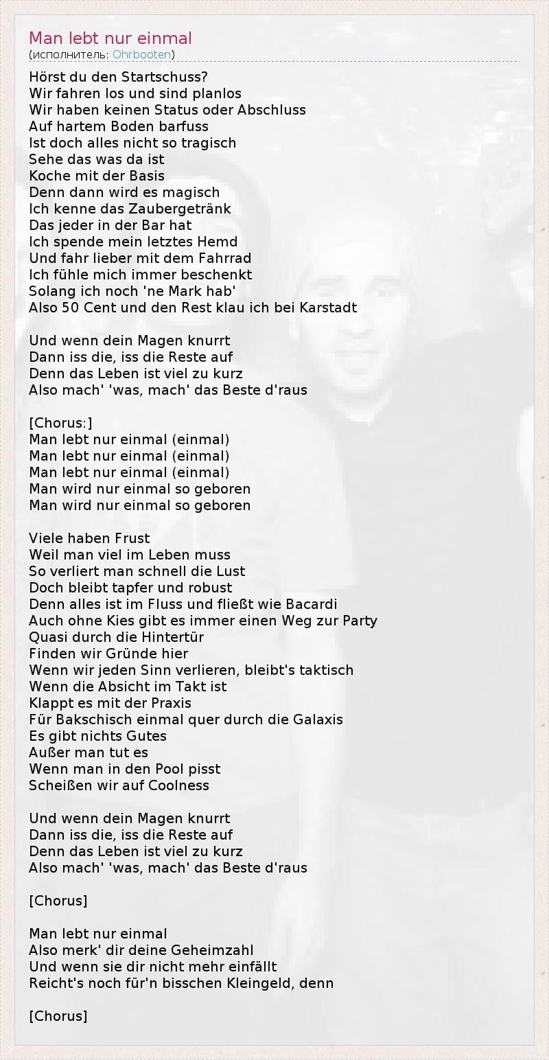 Hörst du den Startschuss? Wir fahren los und sind planlos Wir haben keinen Status oder Abschluss Auf hartem Boden barfuss Ist doch alles nicht so tragisch Sehe das was da ist Koche mit der Basis Denn dann wird es magisch Ich kenne das Zaubergetränk Das jeder in der Bar hat Ich spende mein letztes Hemd Und fahr lieber mit dem Fahrrad Ich fühle mich immer beschenkt Solang ich noch 'ne Mark hab' Also 50 Cent und den Rest klau ich bei Karstadt Und wenn dein Magen knurrt Dann iss die, iss die Reste auf Denn das Leben ist viel zu kurz Also mach' 'was, mach' das Beste d'raus [Chorus:] Man lebt nur einmal (einmal) Man lebt nur einmal (einmal) Man lebt nur einmal (einmal) Man wird nur einmal so geboren Man wird nur einmal so geboren Viele haben Frust Weil man viel im Leben muss So verliert man schnell die Lust Doch bleibt tapfer und robust Denn alles ist im Fluss und fließt wie Bacardi Auch ohne Kies gibt es immer einen Weg zur Party Quasi durch die Hintertür Finden wir Gründe hier Wenn wir jeden Sinn verlieren, bleibt's taktisch Wenn die Absicht im Takt ist Klappt es mit der Praxis Für Bakschisch einmal quer durch die Galaxis Es gibt nichts Gutes Außer man tut es Wenn man in den Pool pisst Scheißen wir auf Coolness Und wenn dein Magen knurrt Dann iss die, iss die Reste auf Denn das Leben ist viel zu kurz Also mach' 'was, mach' das Beste d'raus [Chorus] Man lebt nur einmal Also merk' dir deine Geheimzahl Und wenn sie dir nicht mehr einfällt Reicht's noch für'n bisschen Kleingeld, denn [Chorus]