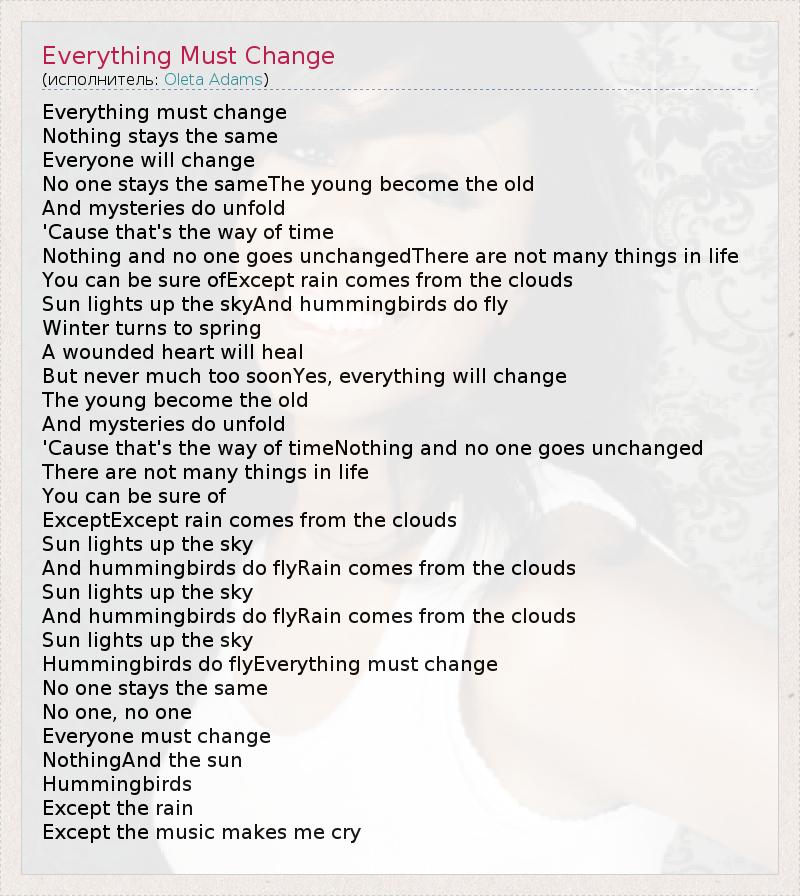 Everything must change Nothing stays the same Everyone will change No one stays the sameThe young become the old And mysteries do unfold 'Cause that's the way of time Nothing and no one goes unchangedThere are not many things in life You can be sure ofExcept rain comes from the clouds Sun lights up the skyAnd hummingbirds do fly Winter turns to spring A wounded heart will heal But never much too soonYes, everything will change The young become the old And mysteries do unfold 'Cause that's the way of timeNothing and no one goes unchanged There are not many things in life You can be sure of ExceptExcept rain comes from the clouds Sun lights up the sky And hummingbirds do flyRain comes from the clouds Sun lights up the sky And hummingbirds do flyRain comes from the clouds Sun lights up the sky Hummingbirds do flyEverything must change No one stays the same No one, no one Everyone must change NothingAnd the sun Hummingbirds Except the rain Except the music makes me cry