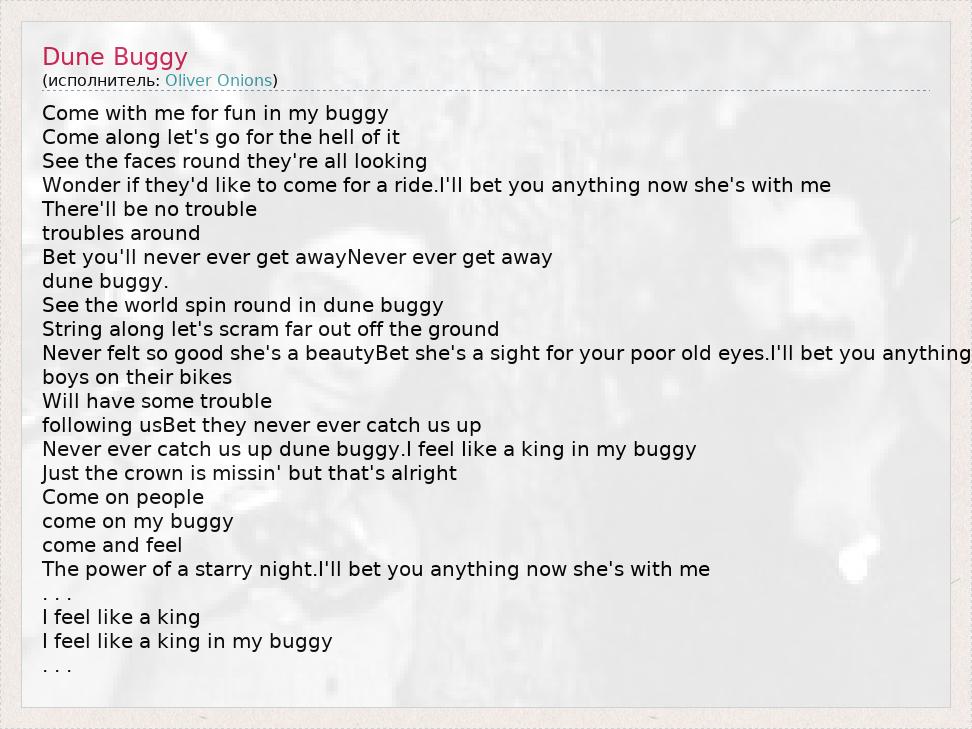 Come with me for fun in my buggy Come along let's go for the hell of it See the faces round they're all looking Wonder if they'd like to come for a ride.I'lI bet you anything now she's with me There'll be no trouble troubles around Bet you'll never ever get awayNever ever get away dune buggy. See the world spin round in dune buggy String along let's scram far out off the ground Never felt so good she's a beautyBet she's a sight for your poor old eyes.I'll bet you anything boys on their bikes Will have some trouble following usBet they never ever catch us up Never ever catch us up dune buggy.I feel Iike a king in my buggy Just the crown is missin' but that's alright Come on people come on my buggy come and feel The power of a starry night.I'll bet you anything now she's with me . . . I feel like a king I feel like a king in my buggy . . .