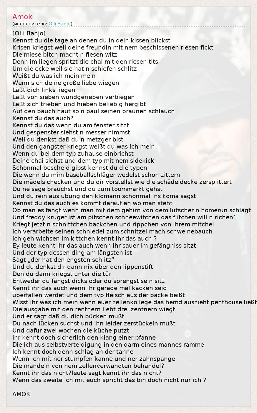 [Olli Banjo] Kennst du die tage an denen du in dein kissen blickst Krisen kriegst weil deine freundin mit nem beschissenen riesen fickt Die miese bitch macht n fiesen witz Denn im liegen spritzt die chai mit den riesen tits Um die ecke weil sie hat n schiefen schlitz Weißt du was ich mein mein Wenn sich deine große liebe wiegen Läßt dich links liegen Läßt von sieben wundgerieben verbiegen Läßt sich trieben und hieben beliebig hergibt Auf den bauch haut so n paul seinen braunen schlauch Kennst du das auch? Kennst du das wenn du am fenster sitzt Und gespenster siehst n messer nimmst Weil du denkst daß du n metzger bist Und den gangster kriegst weißt du was ich mein Wenn du bei dem typ zuhause einbrichst Deine chai siehst und dem typ mit nem sidekick Schonmal bescheid gibst kennst du die typen Die wenn du mim baseballschläger wedelst schon zittern Die mädels checken und du dir vorstellst wie die schädeldecke zersplittert Du ne säge brauchst und du zum toommarkt gehst Und du rein aus übung den klomann schonmal ins koma sägst Kennst du das auch es kommt darauf an wo man steht Ob man es fängt wenn man mit dem gehirn von dem lutscher n homerun schlägt Und freddy kruger ist am pitschen schneewitchen das flitchen will n richen` Kriegt jetzt n schnittchen,bäckchen und rippchen von ihrem mitchel Ich verarbeite seinen schniedel zum schnitzel mach schweinebauch Ich geh wichsen im kittchen kennt ihr das auch ? Ey leute kennt ihr das auch wenn ihr sauer im gefängniss sitzt Und der typ dessen ding am längsten ist Sagt „der hat den engsten schlitz“ Und du denkst dir dann nix über den lippenstift Den du dann kriegst unter die tür Entweder du fängst dicks oder du sprengst sein sitz Kennt ihr das auch wenn ihr gerade mal kacken seid überfallen werdet und dem typ fleisch aus der backe beißt Wisst ihr was ich mein wenn euer zellenkollege das hemd auszieht penthouse ließt Die ausgabe mit den rentnern liebt drei zentnern wiegt Und er sagt daß du dich bücken mußt Du nach lücken suchst und ihn leider zerstückeln mußt Und dafür zwei wochen die küche putzt Ihr kennt doch sicherlich den klang einer pfanne Die ich aus selbstverteidigung in den darm eines mannes ramme Ich kennt doch denn schlag an der tanne Wenn ich mit ner stumpfen kanne und ner zahnspange Die mandeln von nem zellenverwandten behandel? Kennt ihr das nicht?leute sagt kennt ihr das nicht? Wenn das zweite ich mit euch spricht das bin doch nicht nur ich ? AMOK