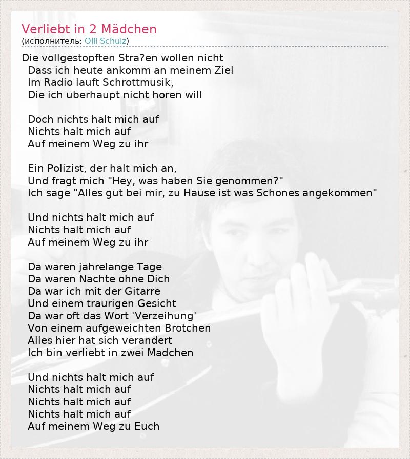 Die vollgestopften Stra?en wollen nicht Dass ich heute ankomm an meinem Ziel Im Radio lauft Schrottmusik, Die ich uberhaupt nicht horen will Doch nichts halt mich auf Nichts halt mich auf Auf meinem Weg zu ihr Ein Polizist, der halt mich an, Und fragt mich "Hey, was haben Sie genommen?" Ich sage "Alles gut bei mir, zu Hause ist was Schones angekommen" Und nichts halt mich auf Nichts halt mich auf Auf meinem Weg zu ihr Da waren jahrelange Tage Da waren Nachte ohne Dich Da war ich mit der Gitarre Und einem traurigen Gesicht Da war oft das Wort 'Verzeihung' Von einem aufgeweichten Brotchen Alles hier hat sich verandert Ich bin verliebt in zwei Madchen Und nichts halt mich auf Nichts halt mich auf Nichts halt mich auf Nichts halt mich auf Auf meinem Weg zu Euch