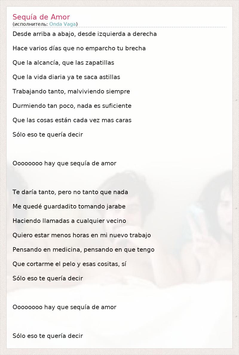 Desde arriba a abajo, desde izquierda a derecha Hace varios días que no emparcho tu brecha Que la alcancía, que las zapatillas Que la vida diaria ya te saca astillas Trabajando tanto, malviviendo siempre Durmiendo tan poco, nada es suficiente Que las cosas están cada vez mas caras Sólo eso te quería decir Oooooooo hay que sequía de amor Te daría tanto, pero no tanto que nada Me quedé guardadito tomando jarabe Haciendo llamadas a cualquier vecino Quiero estar menos horas en mi nuevo trabajo Pensando en medicina, pensando en que tengo Que cortarme el pelo y esas cositas, sí Sólo eso te quería decir Oooooooo hay que sequía de amor Sólo eso te quería decir