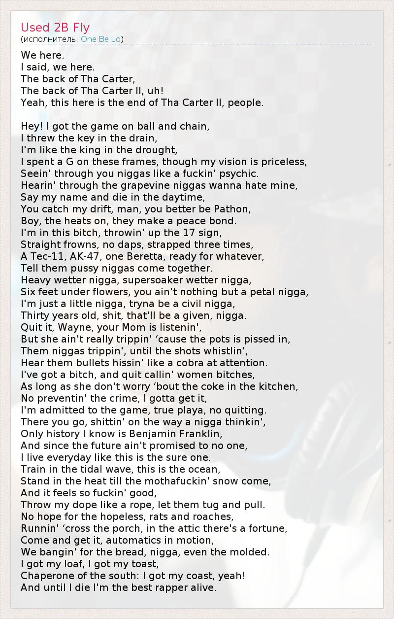 Мы тут. Я сказал, мы тут. Позади "Tha Carter", Позади "Tha Carter II", ух! Да, это конец "Tha Carter II", народ. Эй, я приковал рэп к чугунному ядру цепью И выбросил ключ в канаву, Я как король в трущобах, Потратил косарь на очки, хотя мой взгляд бесценен, Я вижу вас насквозь, ниггеры, как долбанный экстрасенс. Птичка тут напела, что черномазые ненавидят меня, Произнеси моё имя и умрёшь средь бела дня, Ты поймал мою волну, чувак, надеюсь, ты как Патон, 1 Парень, появились стволы, и они выносят тебе запрет, Я читаю тут, показывая знак семнадцатого округа, 2 Суровый вид, никаких приветствий, я трижды вооружён: Tec-11, АК-47 и "Беретта" готовы к чему угодно, 3 Скажи этим слабакам, чтобы держались вместе. Проливаю много крови, больше, чем водяной пистолет, Из тебя вырастут цветы, ты всего лишь лепесток, ниггер, Я просто малой ниггер, пытающийся стать вежливым ниггером К тридцати годам, блин, это будет данностью, ниггер. Завязывай, Уэйн, твоя мама слушает, Но она, вообще-то, не злится: в горшок уже напрудили, А черномазые бесятся, пока не просвистят пули, Слышите? Пули свистят, как кобра в стойке. У меня есть с**ка, и хватит называть женщин с**ми, Пока её не волнует кокаин на кухне, Преступление не предотвратят, я должен заняться им, Я допущен к игре, настоящий боец и уходить не собираюсь. Ну, начинается: вы обс**аете то, как ниггер думает, Из истории я знаю только Бенджамина Франклина, И раз уж будущее никому не гарантировано, Я проживаю каждый день с уверенностью. Ты тренируешься в приливной волне, а это океан, Я стою на жаре, пока не выпадет снег, мать его, И мне так хорошо, блин, Я бросал дурь, словно верёвку, и смотрел, как её потягивают и крутят. Нет надежды для безнадёжных, крыс и букашек, Взбегаю по крыльцу — на чердаке целое состояние, Иди, возьми его, автомат-то работает, Мы стреляем ради хлеба, ниггер, даже формового. У меня есть батон, у меня есть тост, Смотрящий за югом, у меня своё побережье, ага! И пока не умру, я останусь лучшим рэпером среди живущих. 1 — Джером Патон — тренер по американскому футболу и бывший профессиональный игрок. 2 — Лил Уэйн вырос в17-м округе Нового Орлеана. 3 — Kel-Tec P-11 — компактный полуавтоматический 9-мм пистолет с малой отдачи. Беретта — одна из главных итальянских компаний по производству оружия.