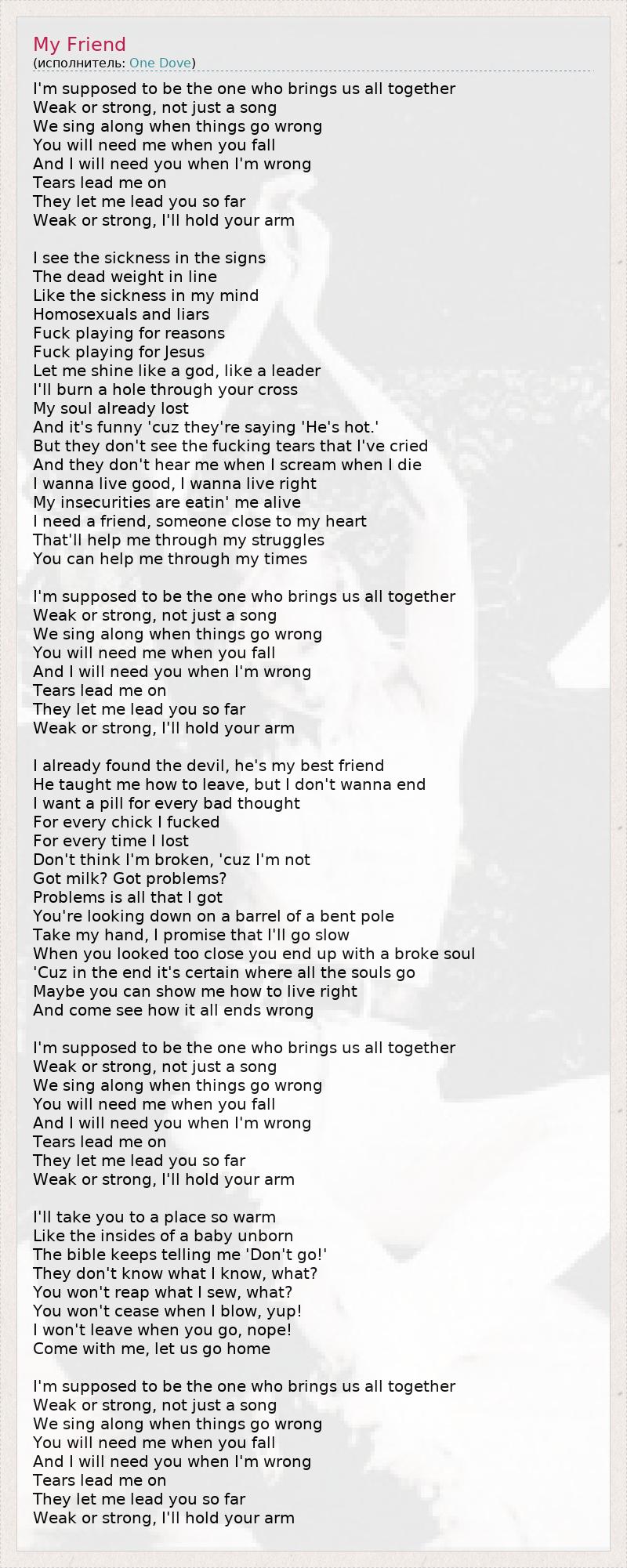 I'm supposed to be the one who brings us all together Weak or strong, not just a song We sing along when things go wrong You will need me when you fall And I will need you when I'm wrong Tears lead me on They let me lead you so far Weak or strong, I'll hold your arm I see the sickness in the signs The dead weight in line Like the sickness in my mind Homosexuals and liars Fuck playing for reasons Fuck playing for Jesus Let me shine like a god, like a leader I'll burn a hole through your cross My soul already lost And it's funny 'cuz they're saying 'He's hot.' But they don't see the fucking tears that I've cried And they don't hear me when I scream when I die I wanna live good, I wanna live right My insecurities are eatin' me alive I need a friend, someone close to my heart That'll help me through my struggles You can help me through my times I'm supposed to be the one who brings us all together Weak or strong, not just a song We sing along when things go wrong You will need me when you fall And I will need you when I'm wrong Tears lead me on They let me lead you so far Weak or strong, I'll hold your arm I already found the devil, he's my best friend He taught me how to leave, but I don't wanna end I want a pill for every bad thought For every chick I fucked For every time I lost Don't think I'm broken, 'cuz I'm not Got milk? Got problems? Problems is all that I got You're looking down on a barrel of a bent pole Take my hand, I promise that I'll go slow When you looked too close you end up with a broke soul 'Cuz in the end it's certain where all the souls go Maybe you can show me how to live right And come see how it all ends wrong I'm supposed to be the one who brings us all together Weak or strong, not just a song We sing along when things go wrong You will need me when you fall And I will need you when I'm wrong Tears lead me on They let me lead you so far Weak or strong, I'll hold your arm I'll take you to a place so warm Like the insides of a baby unborn The bible keeps telling me 'Don't go!' They don't know what I know, what? You won't reap what I sew, what? You won't cease when I blow, yup! I won't leave when you go, nope! Come with me, let us go home I'm supposed to be the one who brings us all together Weak or strong, not just a song We sing along when things go wrong You will need me when you fall And I will need you when I'm wrong Tears lead me on They let me lead you so far Weak or strong, I'll hold your arm