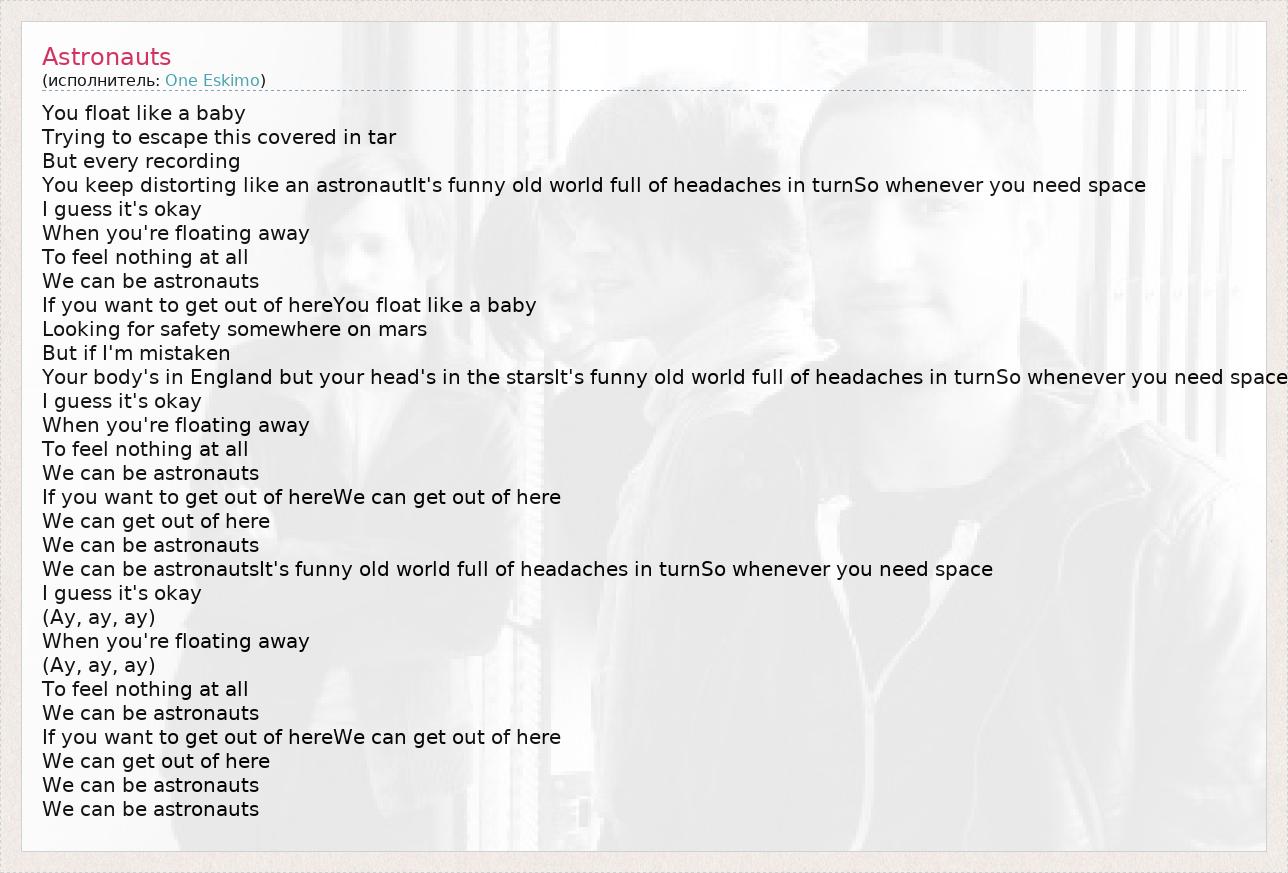 You float like a baby Trying to escape this covered in tar But every recording You keep distorting like an astronautIt's funny old world full of headaches in turnSo whenever you need space I guess it's okay When you're floating away To feel nothing at all We can be astronauts If you want to get out of hereYou float like a baby Looking for safety somewhere on mars But if I'm mistaken Your body's in England but your head's in the starsIt's funny old world full of headaches in turnSo whenever you need space I guess it's okay When you're floating away To feel nothing at all We can be astronauts If you want to get out of hereWe can get out of here We can get out of here We can be astronauts We can be astronautsIt's funny old world full of headaches in turnSo whenever you need space I guess it's okay (Ay, ay, ay) When you're floating away (Ay, ay, ay) To feel nothing at all We can be astronauts If you want to get out of hereWe can get out of here We can get out of here We can be astronauts We can be astronauts