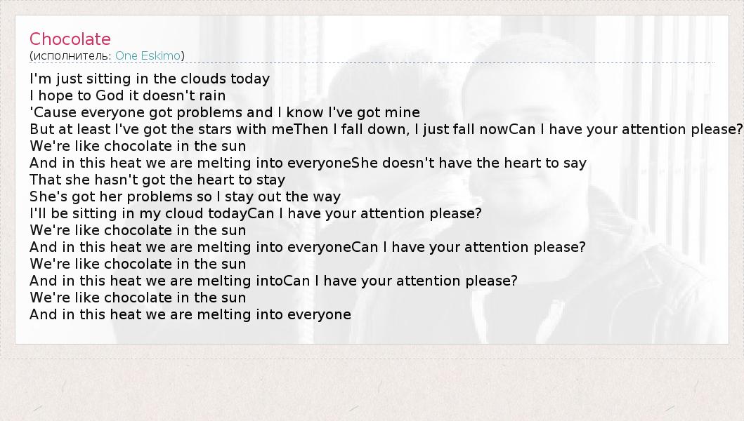 I'm just sitting in the clouds today I hope to God it doesn't rain 'Cause everyone got problems and I know I've got mine But at least I've got the stars with meThen I fall down, I just fall nowCan I have your attention please? We're like chocolate in the sun And in this heat we are melting into everyoneShe doesn't have the heart to say That she hasn't got the heart to stay She's got her problems so I stay out the way I'll be sitting in my cloud todayCan I have your attention please? We're like chocolate in the sun And in this heat we are melting into everyoneCan I have your attention please? We're like chocolate in the sun And in this heat we are melting intoCan I have your attention please? We're like chocolate in the sun And in this heat we are melting into everyone