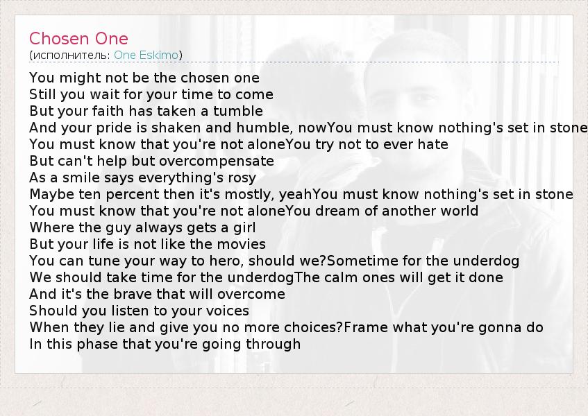You might not be the chosen one Still you wait for your time to come But your faith has taken a tumble And your pride is shaken and humble, nowYou must know nothing's set in stone You must know that you're not aloneYou try not to ever hate But can't help but overcompensate As a smile says everything's rosy Maybe ten percent then it's mostly, yeahYou must know nothing's set in stone You must know that you're not aloneYou dream of another world Where the guy always gets a girl But your life is not like the movies You can tune your way to hero, should we?Sometime for the underdog We should take time for the underdogThe calm ones will get it done And it's the brave that will overcome Should you listen to your voices When they lie and give you no more choices?Frame what you're gonna do In this phase that you're going through