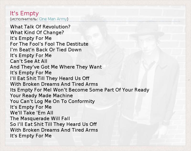 Это интересно:One Man Army - панк-рок группа, которая сформировалась в Сан-Франциско в 1996. Первая группа Джека Далримпла и Брэндона Поллака из Dead To Me. Дебютный альбом Dead End Stories был первым выпуском на Adeline Records, лейбле Билли Джо Армстронга.Долгое время циркулировавшие слухи о том, что не все в порядке с группой One Man Army оказались не просто слухами. В 2005 группа распалась. В последнее время участники OMA были заняты... продолжение