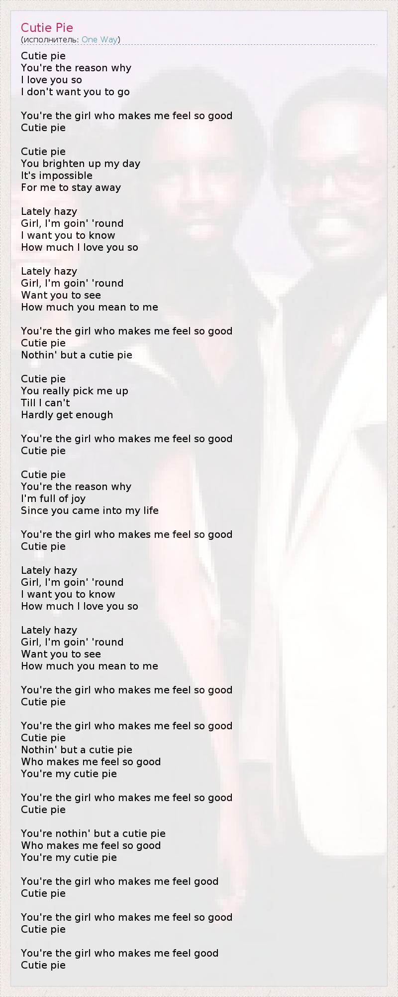 Cutie pie You're the reason why I love you so I don't want you to go You're the girl who makes me feel so good Cutie pie Cutie pie You brighten up my day It's impossible For me to stay away Lately hazy Girl, I'm goin' 'round I want you to know How much I love you so Lately hazy Girl, I'm goin' 'round Want you to see How much you mean to me You're the girl who makes me feel so good Cutie pie Nothin' but a cutie pie Cutie pie You really pick me up Till I can't Hardly get enough You're the girl who makes me feel so good Cutie pie Cutie pie You're the reason why I'm full of joy Since you came into my life You're the girl who makes me feel so good Cutie pie Lately hazy Girl, I'm goin' 'round I want you to know How much I love you so Lately hazy Girl, I'm goin' 'round Want you to see How much you mean to me You're the girl who makes me feel so good Cutie pie You're the girl who makes me feel so good Cutie pie Nothin' but a cutie pie Who makes me feel so good You're my cutie pie You're the girl who makes me feel so good Cutie pie You're nothin' but a cutie pie Who makes me feel so good You're my cutie pie You're the girl who makes me feel good Cutie pie You're the girl who makes me feel so good Cutie pie You're the girl who makes me feel good Cutie pie