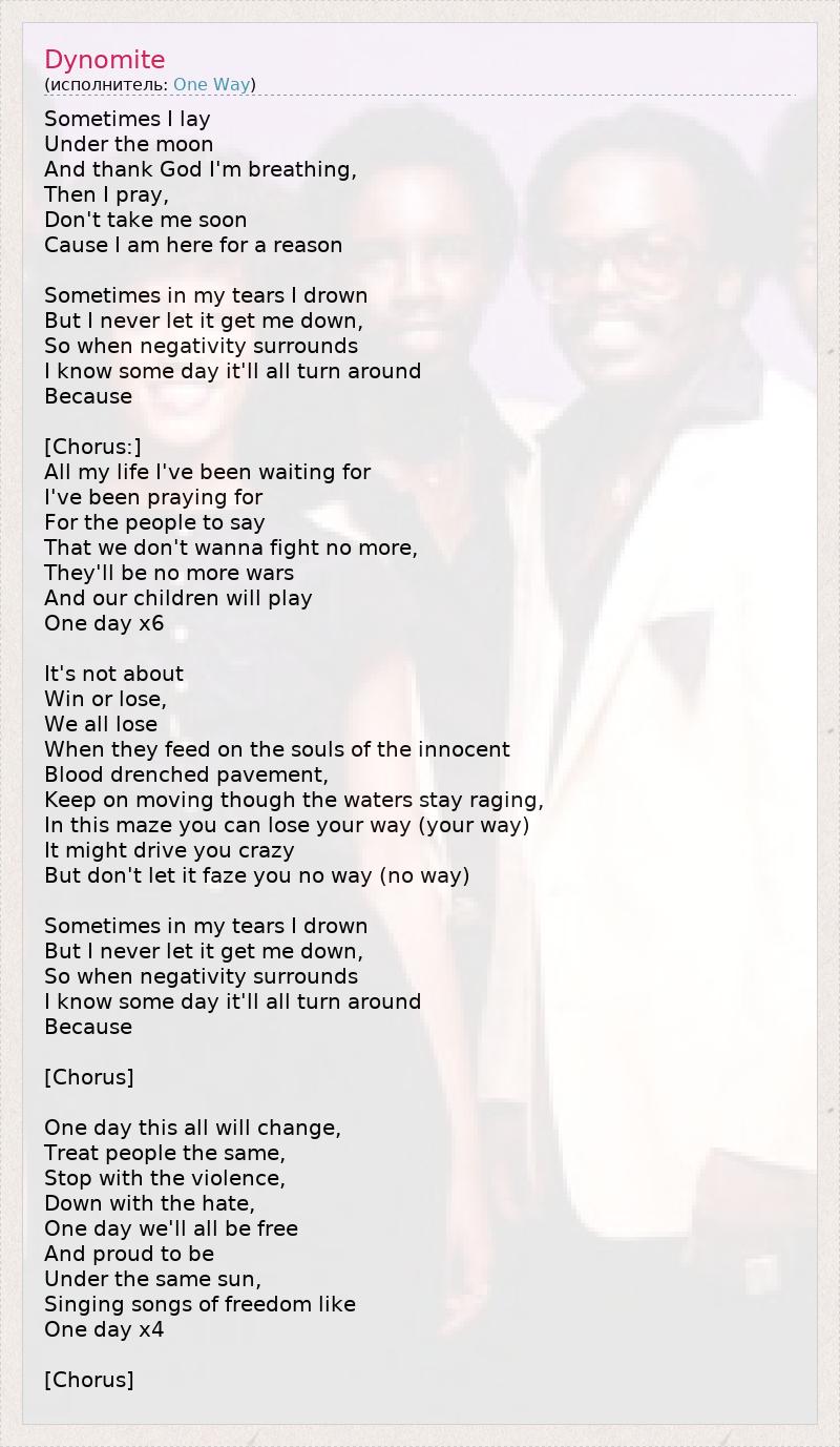 Sometimes I lay Under the moon And thank God I'm breathing, Then I pray, Don't take me soon Cause I am here for a reason Sometimes in my tears I drown But I never let it get me down, So when negativity surrounds I know some day it'll all turn around Because [Chorus:] All my life I've been waiting for I've been praying for For the people to say That we don't wanna fight no more, They'll be no more wars And our children will play One day x6 It's not about Win or lose, We all lose When they feed on the souls of the innocent Blood drenched pavement, Keep on moving though the waters stay raging, In this maze you can lose your way (your way) It might drive you crazy But don't let it faze you no way (no way) Sometimes in my tears I drown But I never let it get me down, So when negativity surrounds I know some day it'll all turn around Because [Chorus] One day this all will change, Treat people the same, Stop with the violence, Down with the hate, One day we'll all be free And proud to be Under the same sun, Singing songs of freedom like One day x4 [Chorus]