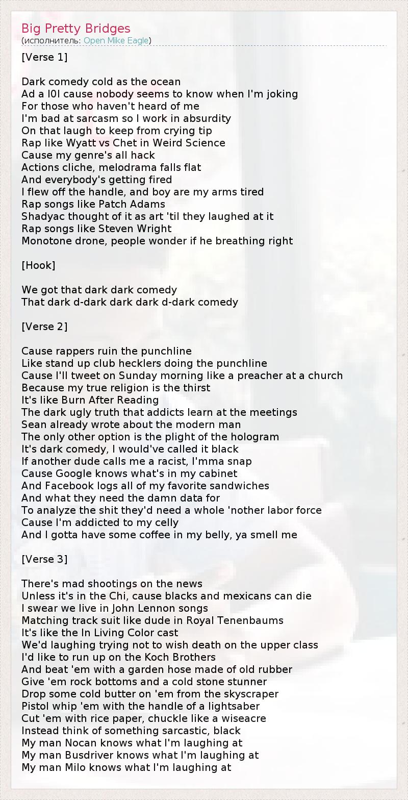 А как ты думаешь, о чем песня "Big Pretty Bridges" ?