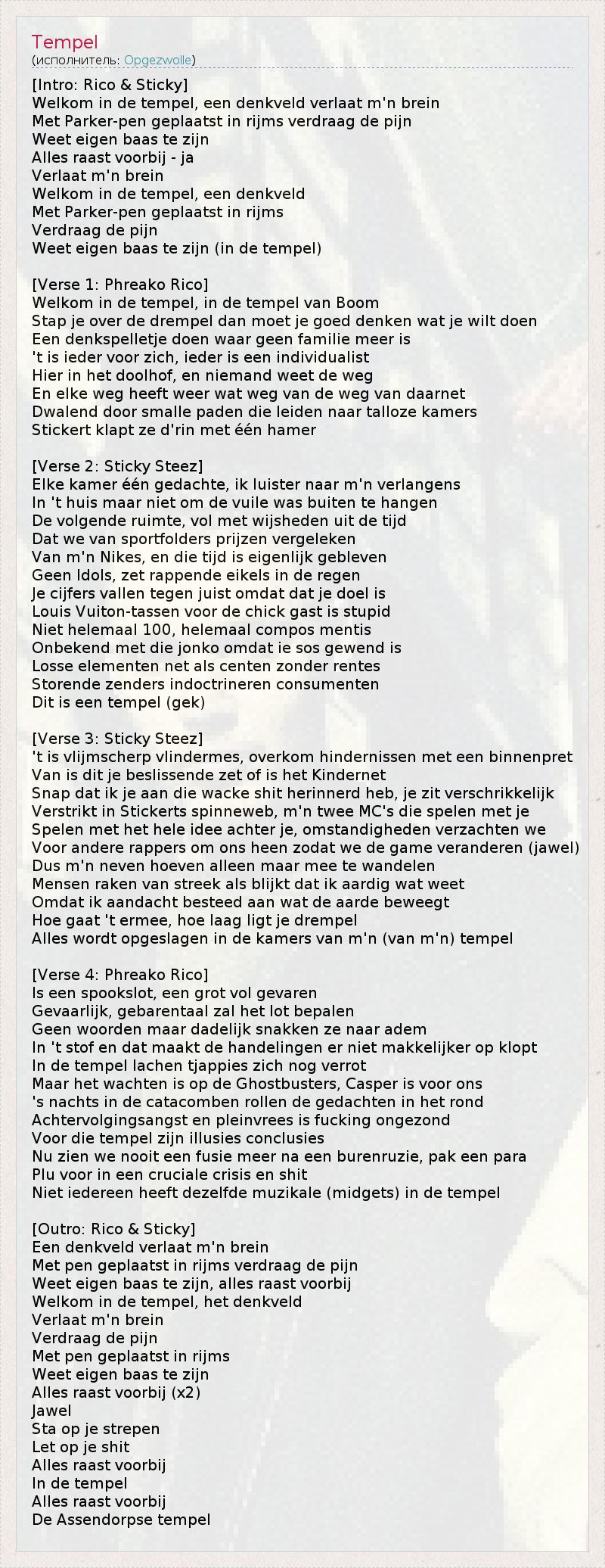 [Intro: Rico & Sticky] Welkom in de tempel, een denkveld verlaat m'n brein Met Parker-pen geplaatst in rijms verdraag de pijn Weet eigen baas te zijn Alles raast voorbij - ja Verlaat m'n brein Welkom in de tempel, een denkveld Met Parker-pen geplaatst in rijms Verdraag de pijn Weet eigen baas te zijn (in de tempel) [Verse 1: Phreako Rico] Welkom in de tempel, in de tempel van Boom Stap je over de drempel dan moet je goed denken wat je wilt doen Een denkspelletje doen waar geen familie meer is 't is ieder voor zich, ieder is een individualist Hier in het doolhof, en niemand weet de weg En elke weg heeft weer wat weg van de weg van daarnet Dwalend door smalle paden die leiden naar talloze kamers Stickert klapt ze d'rin met één hamer [Verse 2: Sticky Steez] Elke kamer één gedachte, ik luister naar m'n verlangens In 't huis maar niet om de vuile was buiten te hangen De volgende ruimte, vol met wijsheden uit de tijd Dat we van sportfolders prijzen vergeleken Van m'n Nikes, en die tijd is eigenlijk gebleven Geen Idols, zet rappende eikels in de regen Je cijfers vallen tegen juist omdat dat je doel is Louis Vuiton-tassen voor de chick gast is stupid Niet helemaal 100, helemaal compos mentis Onbekend met die jonko omdat ie sos gewend is Losse elementen net als centen zonder rentes Storende zenders indoctrineren consumenten Dit is een tempel (gek) [Verse 3: Sticky Steez] 't is vlijmscherp vlindermes, overkom hindernissen met een binnenpret Van is dit je beslissende zet of is het Kindernet Snap dat ik je aan die wacke shit herinnerd heb, je zit verschrikkelijk Verstrikt in Stickerts spinneweb, m'n twee MC's die spelen met je Spelen met het hele idee achter je, omstandigheden verzachten we Voor andere rappers om ons heen zodat we de game veranderen (jawel) Dus m'n neven hoeven alleen maar mee te wandelen Mensen raken van streek als blijkt dat ik aardig wat weet Omdat ik aandacht besteed aan wat de aarde beweegt Hoe gaat 't ermee, hoe laag ligt je drempel Alles wordt opgeslagen in de kamers van m'n (van m'n) tempel [Verse 4: Phreako Rico] Is een spookslot, een grot vol gevaren Gevaarlijk, gebarentaal zal het lot bepalen Geen woorden maar dadelijk snakken ze naar adem In 't stof en dat maakt de handelingen er niet makkelijker op klopt In de tempel lachen tjappies zich nog verrot Maar het wachten is op de Ghostbusters, Casper is voor ons 's nachts in de catacomben rollen de gedachten in het rond Achtervolgingsangst en pleinvrees is fucking ongezond Voor die tempel zijn illusies conclusies Nu zien we nooit een fusie meer na een burenruzie, pak een para Plu voor in een cruciale crisis en shit Niet iedereen heeft dezelfde muzikale (midgets) in de tempel [Outro: Rico & Sticky] Een denkveld verlaat m'n brein Met pen geplaatst in rijms verdraag de pijn Weet eigen baas te zijn, alles raast voorbij Welkom in de tempel, het denkveld Verlaat m'n brein Verdraag de pijn Met pen geplaatst in rijms Weet eigen baas te zijn Alles raast voorbij (x2) Jawel Sta op je strepen Let op je shit Alles raast voorbij In de tempel Alles raast voorbij De Assendorpse tempel