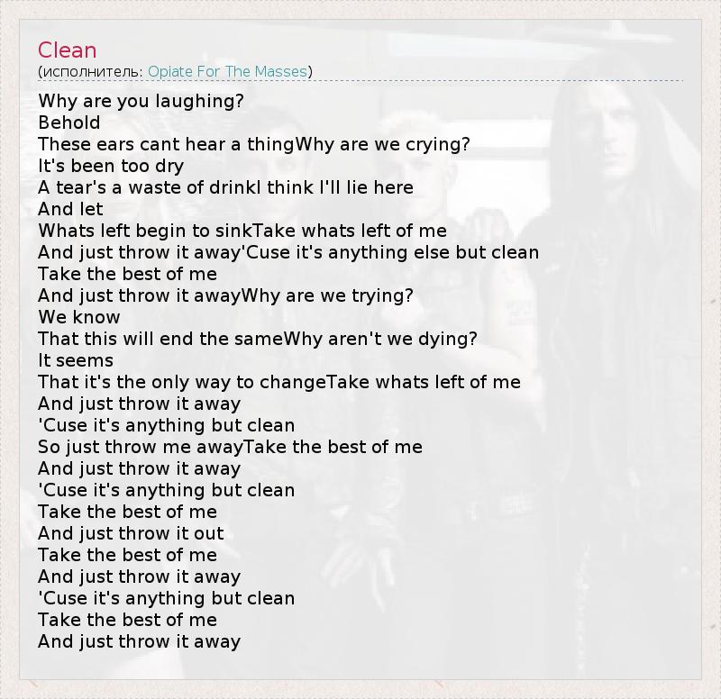 Why are you laughing? Behold These ears cant hear a thingWhy are we crying? It's been too dry A tear's a waste of drinkI think I'll lie here And let Whats left begin to sinkTake whats left of me And just throw it away'Cuse it's anything else but clean Take the best of me And just throw it awayWhy are we trying? We know That this will end the sameWhy aren't we dying? It seems That it's the only way to changeTake whats left of me And just throw it away 'Cuse it's anything but clean So just throw me awayTake the best of me And just throw it away 'Cuse it's anything but clean Take the best of me And just throw it out Take the best of me And just throw it away 'Cuse it's anything but clean Take the best of me And just throw it away