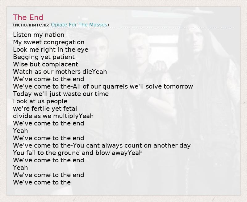Это интересно:Opiate for the Masses - американская пост-хардкор группа из Аризоны. Была создана в Финиксе в 1999 Роном Андервудом, Элиасом Маллином, Дастином Лайоном и Джимом Кауфманом. Название группы пришло из работ Карла Маркса, писавшего, что религия - ничто иное, как "опиум для народа".Две композиции группы, а именно "Dead underground" и "Step up", были представлены в составе OST к фильмам "Пила 2,3".... продолжение