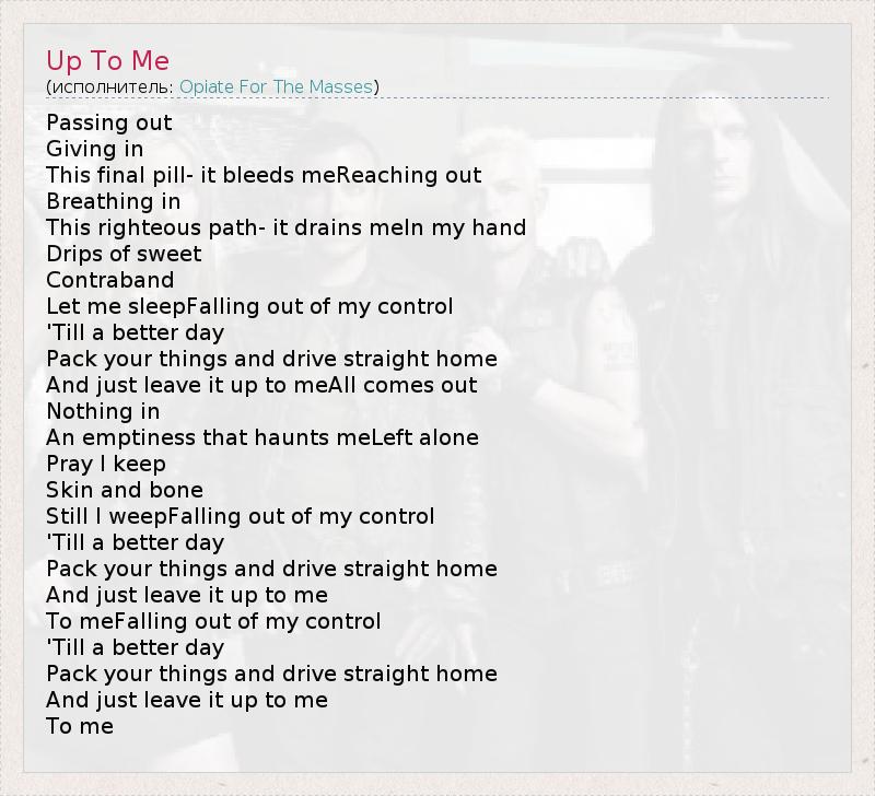 Это интересно:Opiate for the Masses - американская пост-хардкор группа из Аризоны. Была создана в Финиксе в 1999 Роном Андервудом, Элиасом Маллином, Дастином Лайоном и Джимом Кауфманом. Название группы пришло из работ Карла Маркса, писавшего, что религия - ничто иное, как "опиум для народа".Две композиции группы, а именно "Dead underground" и "Step up", были представлены в составе OST к фильмам "Пила 2,3".... продолжение