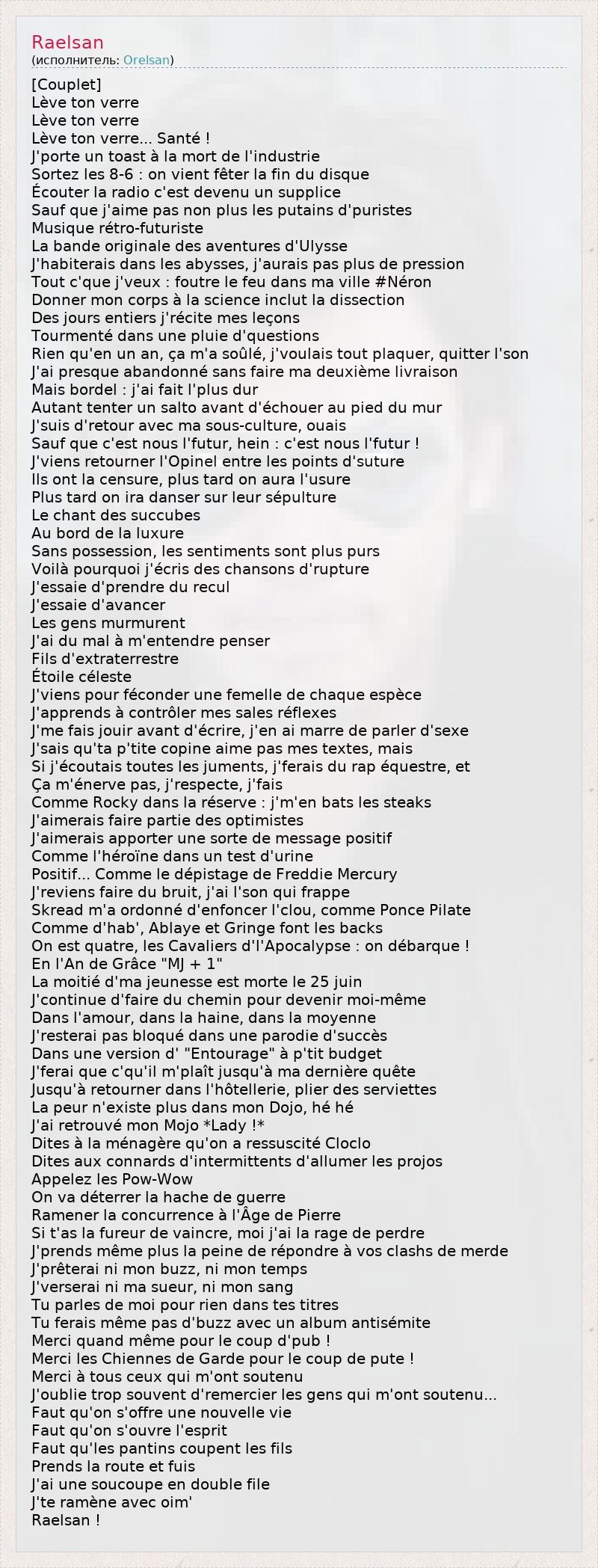 [Couplet] Lève ton verre Lève ton verre Lève ton verre... Santé ! J'porte un toast à la mort de l'industrie Sortez les 8-6 : on vient fêter la fin du disque Écouter la radio c'est devenu un supplice Sauf que j'aime pas non plus les putains d'puristes Musique rétro-futuriste La bande originale des aventures d'Ulysse J'habiterais dans les abysses, j'aurais pas plus de pression Tout c'que j'veux : foutre le feu dans ma ville #Néron Donner mon corps à la science inclut la dissection Des jours entiers j'récite mes leçons Tourmenté dans une pluie d'questions Rien qu'en un an, ça m'a soûlé, j'voulais tout plaquer, quitter l'son J'ai presque abandonné sans faire ma deuxième livraison Mais bordel : j'ai fait l'plus dur Autant tenter un salto avant d'échouer au pied du mur J'suis d'retour avec ma sous-culture, ouais Sauf que c'est nous l'futur, hein : c'est nous l'futur ! J'viens retourner l'Opinel entre les points d'suture Ils ont la censure, plus tard on aura l'usure Plus tard on ira danser sur leur sépulture Le chant des succubes Au bord de la luxure Sans possession, les sentiments sont plus purs Voilà pourquoi j'écris des chansons d'rupture J'essaie d'prendre du recul J'essaie d'avancer Les gens murmurent J'ai du mal à m'entendre penser Fils d'extraterrestre Étoile céleste J'viens pour féconder une femelle de chaque espèce J'apprends à contrôler mes sales réflexes J'me fais jouir avant d'écrire, j'en ai marre de parler d'sexe J'sais qu'ta p'tite copine aime pas mes textes, mais Si j'écoutais toutes les juments, j'ferais du rap équestre, et Ça m'énerve pas, j'respecte, j'fais Comme Rocky dans la réserve : j'm'en bats les steaks J'aimerais faire partie des optimistes J'aimerais apporter une sorte de message positif Comme l'héroïne dans un test d'urine Positif... Comme le dépistage de Freddie Mercury J'reviens faire du bruit, j'ai l'son qui frappe Skread m'a ordonné d'enfoncer l'clou, comme Ponce Pilate Comme d'hab', Ablaye et Gringe font les backs On est quatre, les Cavaliers d'l'Apocalypse : on débarque ! En l'An de Grâce "MJ + 1" La moitié d'ma jeunesse est morte le 25 juin J'continue d'faire du chemin pour devenir moi-même Dans l'amour, dans la haine, dans la moyenne J'resterai pas bloqué dans une parodie d'succès Dans une version d' "Entourage" à p'tit budget J'ferai que c'qu'il m'plaît jusqu'à ma dernière quête Jusqu'à retourner dans l'hôtellerie, plier des serviettes La peur n'existe plus dans mon Dojo, hé hé J'ai retrouvé mon Mojo *Lady !* Dites à la ménagère qu'on a ressuscité Cloclo Dites aux connards d'intermittents d'allumer les projos Appelez les Pow-Wow On va déterrer la hache de guerre Ramener la concurrence à l'Âge de Pierre Si t'as la fureur de vaincre, moi j'ai la rage de perdre J'prends même plus la peine de répondre à vos clashs de merde J'prêterai ni mon buzz, ni mon temps J'verserai ni ma sueur, ni mon sang Tu parles de moi pour rien dans tes titres Tu ferais même pas d'buzz avec un album antisémite Merci quand même pour le coup d'pub ! Merci les Chiennes de Garde pour le coup de pute ! Merci à tous ceux qui m'ont soutenu J'oublie trop souvent d'remercier les gens qui m'ont soutenu... Faut qu'on s'offre une nouvelle vie Faut qu'on s'ouvre l'esprit Faut qu'les pantins coupent les fils Prends la route et fuis J'ai une soucoupe en double file J'te ramène avec oim' Raelsan !