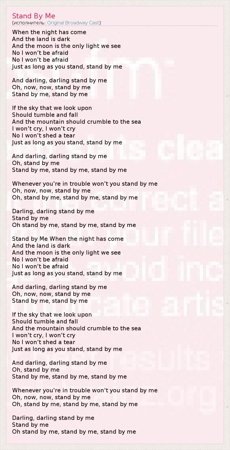 When the night has come And the land is dark And the moon is the only light we see No I won't be afraid No I won't be afraid Just as long as you stand, stand by me And darling, darling stand by me Oh, now, now, stand by me Stand by me, stand by me If the sky that we look upon Should tumble and fall And the mountain should crumble to the sea I won't cry, I won't cry No I won't shed a tear Just as long as you stand, stand by me And darling, darling stand by me Oh, stand by me Stand by me, stand by me, stand by me Whenever you're in trouble won't you stand by me Oh, now, now, stand by me Oh, stand by me, stand by me, stand by me Darling, darling stand by me Stand by me Oh stand by me, stand by me, stand by me Stand by Me When the night has come And the land is dark And the moon is the only light we see No I won't be afraid No I won't be afraid Just as long as you stand, stand by me And darling, darling stand by me Oh, now, now, stand by me Stand by me, stand by me If the sky that we look upon Should tumble and fall And the mountain should crumble to the sea I won't cry, I won't cry No I won't shed a tear Just as long as you stand, stand by me And darling, darling stand by me Oh, stand by me Stand by me, stand by me, stand by me Whenever you're in trouble won't you stand by me Oh, now, now, stand by me Oh, stand by me, stand by me, stand by me Darling, darling stand by me Stand by me Oh stand by me, stand by me, stand by me