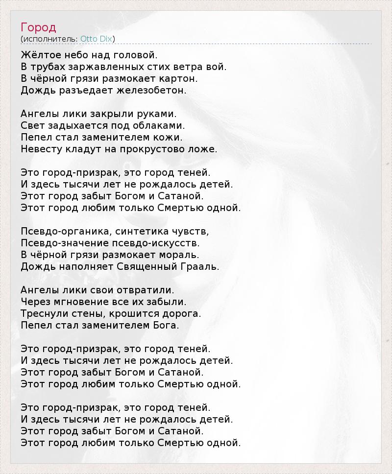 Название дебютного альбома группы Otto Dix неслучайно. Первые ассоциации при слове "Город" возможно, будут самыми безобидными. Метрополия, небоскребы, корпорации, поток гудящих машин — но все это Otto Dix оставляет в стороне. Это не тот город, который воспевается в блюзе – тихая меланхолия и романтичный неон, и не тот город, который мы видим сквозь призму «индастриала» — агрессивный динамизм и беспрерывное движение. Здесь все мертво, все дышит усталостью и тленом, этот мир ирреален и холоден.