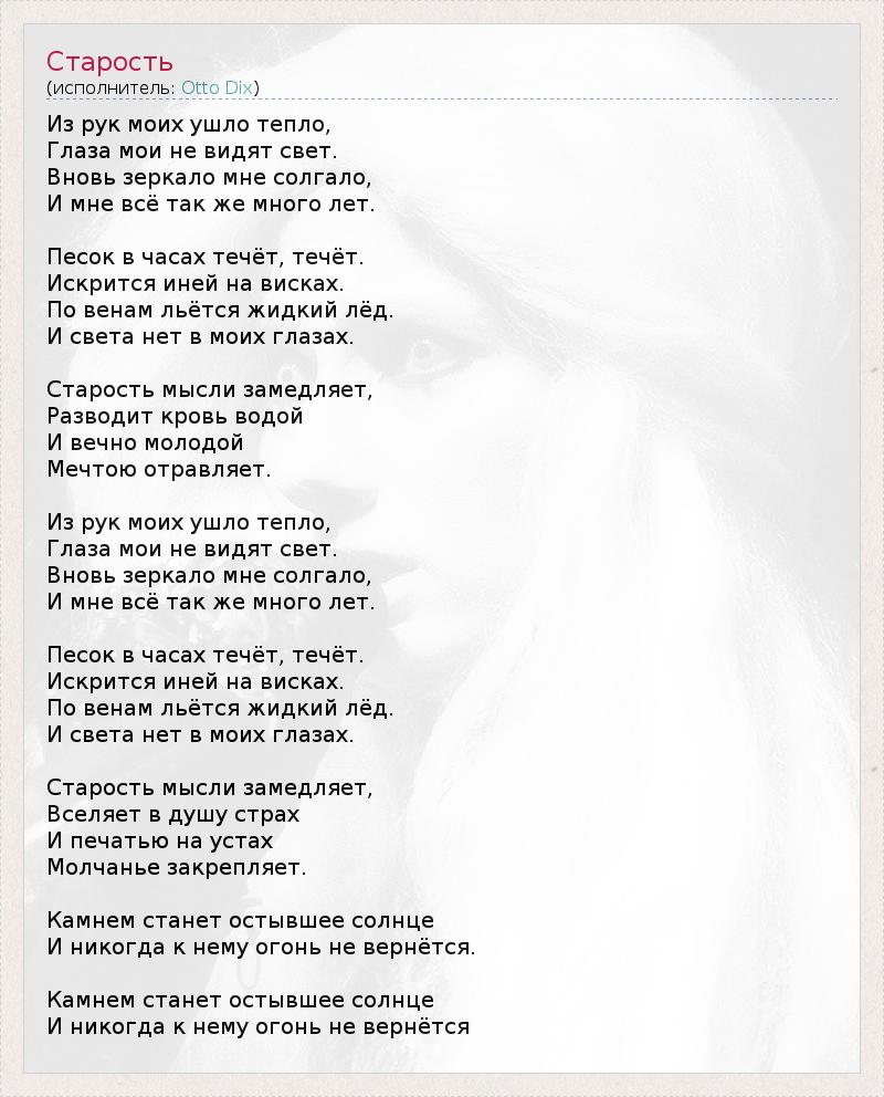 Из рук моих ушло тепло, Глаза мои не видят свет. Вновь зеркало мне солгало, И мне всё так же много лет. Песок в часах течёт, течёт. Искрится иней на висках. По венам льётся жидкий лёд. И света нет в моих глазах. Старость мысли замедляет, Разводит кровь водой И вечно молодой Мечтою отравляет. Из рук моих ушло тепло, Глаза мои не видят свет. Вновь зеркало мне солгало, И мне всё так же много лет. Песок в часах течёт, течёт. Искрится иней на висках. По венам льётся жидкий лёд. И света нет в моих глазах. Старость мысли замедляет, Вселяет в душу страх И печатью на устах Молчанье закрепляет. Камнем станет остывшее солнце И никогда к нему огонь не вернётся. Камнем станет остывшее солнце И никогда к нему огонь не вернётся