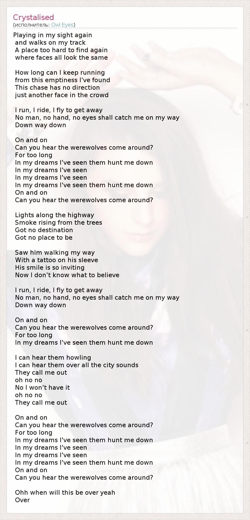 Играя в моих глазах снова и идет на моем пути Место слишком трудно найти снова где лица все выглядят одинаково Как долго я могу продолжать работать от этой пустоты я нашел Это погоня не имеет направления только другое лицо в толпе Я бегу , я еду , я лечу , чтобы уйти Ни один человек , ни стороны, ни глаза не должны поймать меня на моем пути Вниз вниз Все дальше и дальше Слышишь оборотни приходят ? Слишком долго В моих мечтах я видел, как они охотятся меня В моих мечтах я видел В моих мечтах я видел В моих мечтах я видел, как они охотятся меня Все дальше и дальше Слышишь оборотни приходят ? Огни вдоль шоссе Дым поднимается из деревьев Не получил назначение Не получил место быть Видел его ходящим мой путь С татуировкой на рукаве Его улыбка так приглашает Теперь я не знаю, чему верить Я бегу , я еду , я лечу , чтобы уйти Ни один человек , ни стороны, ни глаза не должны поймать меня на моем пути Вниз вниз Все дальше и дальше Слышишь оборотни приходят ? Слишком долго В моих мечтах я видел, как они охотятся меня Я слышу, как они воют Я слышу их по всем звукам города Они называют меня о нет нет Нет , я не буду иметь его о нет нет Они называют меня Все дальше и дальше Слышишь оборотни приходят ? Слишком долго В моих мечтах я видел, как они охотятся меня В моих мечтах я видел В моих мечтах я видел В моих мечтах я видел, как они охотятся меня Все дальше и дальше Слышишь оборотни приходят ? Ооо , когда это будет более да над