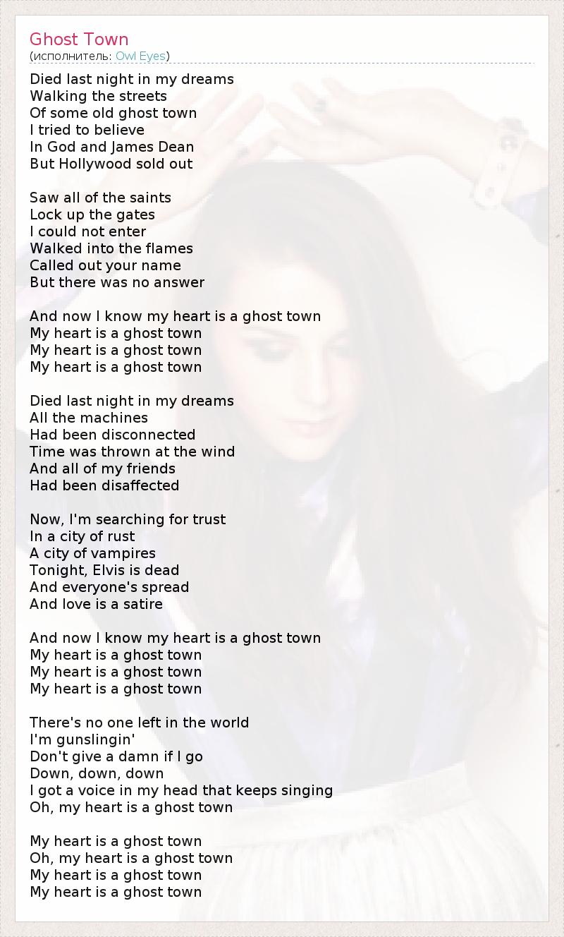 Прошлой ночью я умер во сне, Гуляя по улицам Старого города-призрака. Я пытался поверить В Бога и в Джеймса Дина, Но Голливуд распродан. Я видел, как святые Закрыли врата, И я не смог войти. Я шел сквозь пламя, Выкрикивая твое имя, Но так и не получил ответа. Теперь я знаю, мое сердце - город-призрак. Мое сердце - город-призрак. Мое сердце - город-призрак. Мое сердце - город-призрак. Прошлой ночью я умер во сне, После того, как был отключён От всех аппаратов. Время потрачено впустую, И все мои друзья Недовольны. Сейчас я в поисках веры В выцветшем городе, Городе вампиров. Сегодня ночью умер Элвис И народ рассеялся, Так что любовь - это ирония. Теперь я знаю, мое сердце - город-призрак. Мое сердце - город-призрак. Мое сердце - город-призрак. Мое сердце - город-призрак. В мире не осталось ни души. Я - стрелок, И плевать, если я Проиграю. Голос в моей голове продолжает напевать... Мое сердце - город-призрак. Мое сердце - город-призрак. Мое сердце - город-призрак. Мое сердце - город-призрак. Мое сердце - город-призрак.