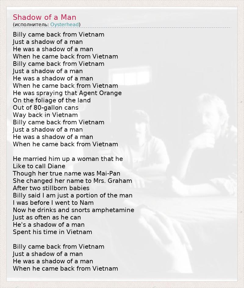 Billy came back from Vietnam Just a shadow of a man He was a shadow of a man When he came back from Vietnam Billy came back from Vietnam Just a shadow of a man He was a shadow of a man When he came back from Vietnam He was spraying that Agent Orange On the foliage of the land Out of 80-gallon cans Way back in Vietnam Billy came back from Vietnam Just a shadow of a man He was a shadow of a man When he came back from Vietnam He married him up a woman that he Like to call Diane Though her true name was Mai-Pan She changed her name to Mrs. Graham After two stillborn babies Billy said I am just a portion of the man I was before I went to Nam Now he drinks and snorts amphetamine Just as often as he can He's a shadow of a man Spent his time in Vietnam Billy came back from Vietnam Just a shadow of a man He was a shadow of a man When he came back from Vietnam