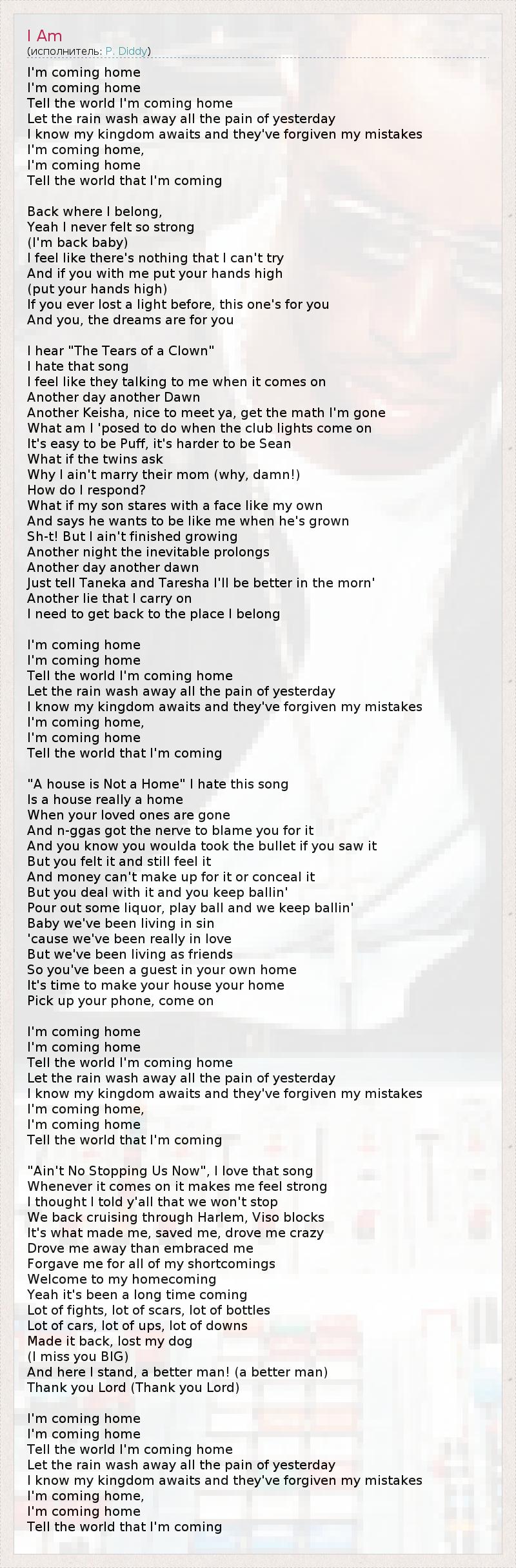 Я возвращаюсь домой, Я возвращаюсь домой, Скажи миру - я возвращаюсь домой! Пусть дождь смоет всю боль вчерашнего дня, Я знаю, меня дожидается моё королевство, а мои ошибки прощены. Я возвращаюсь домой, Я возвращаюсь домой, Скажи миру - я возвращаюсь... Туда, где я должен быть, Да, я никогда не ощущал такого прилива сил, (Я возвращаюсь, детка) Я чувствую себя так, словно нет границ моим возможностям, И если ты со мной - подними руки повыше, (Подними руки повыше) Если ты когда-нибудь теряла свет впереди - это тебе, Тебе, эти мечты для тебя. Я слышу "Слёзы клоуна", Я ненавижу эту песню - Они как будто обращаются ко мне. Очередной день, очередной рассвет, Очередная Кейша, рад тебя видеть, усвой наконец, что меня нет. Чего от меня ждут, когда зажигаются огни в клубе? Легко быть Паффом, труднее - Шоном*. А если близнецы спросят, Почему я не женюсь на их маме (чёрт, почему?), Что я отвечу? Что если мой сын посмотрит моим же взглядом И скажет, что хочет стать похожим на меня, когда вырастет? Чёрт! Я сам ещё не повзрослел, И очередная ночь с неизбежным продолжением, Очередной день, очередной рассвет. Просто скажите Танеке и Тареше, что утром мне будет лучше. Очередное моё враньё, Мне нужно вернуться в своё место. Я возвращаюсь домой, Я возвращаюсь домой, Скажи миру - я возвращаюсь домой! Пусть дождь смоет всю боль вчерашнего дня, Я знаю, меня дожидается моё королевство, а мои ошибки забыты. Я возвращаюсь домой, Я возвращаюсь домой, Скажи миру - я возвращаюсь... "Здание - не дом" - ненавижу эту песню, Но можно ли назвать это место домом, Если твои родные навсегда ушли? Ниг*ерам хватает смелости обвинять тебя в этом, А ты знаешь, что встал бы под пули, будь ты поблизости. Но ты ощущал и всё ещё ощущаешь это, Деньги не компенсируют и не скроют твоих переживаний. Но ты справляешься и продолжаешь развлекаться. Плесни ликёра, сыграем и развлечёмся, Детка, мы согрешили, Потому что у нас была настоящая любовь, Но мы были друзьями, Поэтому ты была гостем в своём доме. Пора сделать это здание твоим домом, Подними трубку, ну же... Я возвращаюсь домой, Я возвращаюсь домой, Скажи миру - я возвращаюсь домой! Пусть дождь смоет всю боль вчерашнего дня, Я знаю, меня дожидается моё королевство, а мои ошибки забыты. Я возвращаюсь домой, Я возвращаюсь домой, Скажи миру - я возвращаюсь... "Ничто теперь не остановит нас" - я обожаю эту песню, Когда бы она ни звучала, она придаёт сил. Я думал, что сказал всем вам, что мы не остановимся, Мы снова едем по Гарлему, кварталам Визо, Они сотворили меня, спасли и свели с ума, Унесли меня и приняли в объятия, Простили мне все недостатки И с радостью впустили домой. Да, путь был долгим - Много драк, шрамов, бутылок, Много машин, взлётов, падений, И я смог вернуться, потеряв друга (мне не хватает тебя, Биг**) И я здесь, счастливчик! (счастливчик) Слава Господу (Слава Господу) Я возвращаюсь домой, Я возвращаюсь домой, Скажи миру - я возвращаюсь домой! Пусть дождь смоет всю боль вчерашнего дня, Я знаю, меня дожидается моё королевство, а мои ошибки забыты. Я возвращаюсь домой, Я возвращаюсь домой, Скажи миру - я возвращаюсь... * - Sean - имя исполнителя, Puff - сценический псевдоним. ** - упоминается рэпер, застреленный в 1997 году.