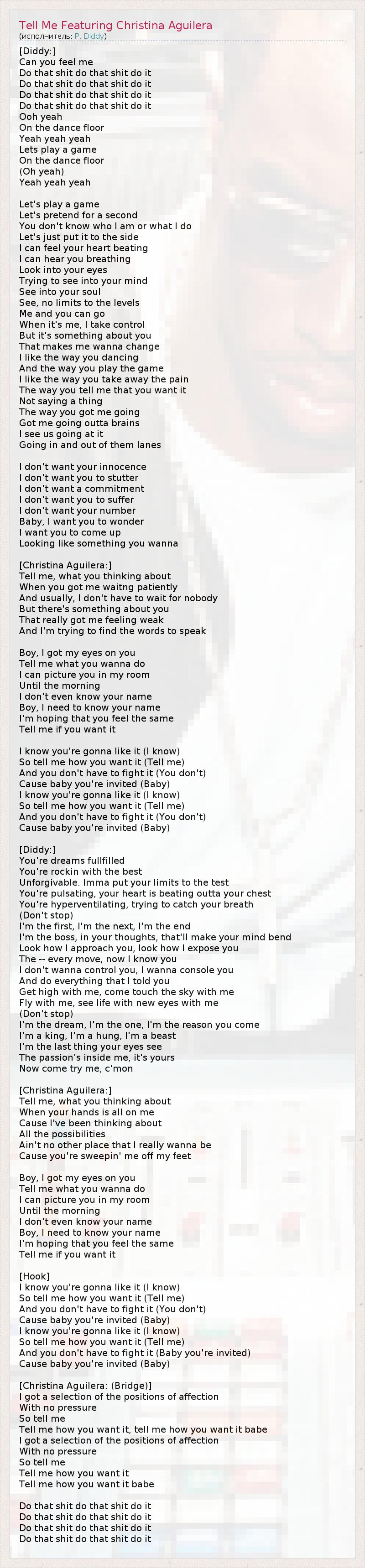 [Diddy:] Can you feel me Do that shit do that shit do it Do that shit do that shit do it Do that shit do that shit do it Do that shit do that shit do it Ooh yeah On the dance floor Yeah yeah yeah Lets play a game On the dance floor (Oh yeah) Yeah yeah yeah Let's play a game Let's pretend for a second You don't know who I am or what I do Let's just put it to the side I can feel your heart beating I can hear you breathing Look into your eyes Trying to see into your mind See into your soul See, no limits to the levels Me and you can go When it's me, I take control But it's something about you That makes me wanna change I like the way you dancing And the way you play the game I like the way you take away the pain The way you tell me that you want it Not saying a thing The way you got me going Got me going outta brains I see us going at it Going in and out of them lanes I don't want your innocence I don't want you to stutter I don't want a commitment I don't want you to suffer I don't want your number Baby, I want you to wonder I want you to come up Looking like something you wanna [Christina Aguilera:] Tell me, what you thinking about When you got me waitng patiently And usually, I don't have to wait for nobody But there's something about you That really got me feeling weak And I'm trying to find the words to speak Boy, I got my eyes on you Tell me what you wanna do I can picture you in my room Until the morning I don't even know your name Boy, I need to know your name I'm hoping that you feel the same Tell me if you want it I know you're gonna like it (I know) So tell me how you want it (Tell me) And you don't have to fight it (You don't) Cause baby you're invited (Baby) I know you're gonna like it (I know) So tell me how you want it (Tell me) And you don't have to fight it (You don't) Cause baby you're invited (Baby) [Diddy:] You're dreams fullfilled You're rockin with the best Unforgivable. Imma put your limits to the test You're pulsating, your heart is beating outta your chest You're hyperventilating, trying to catch your breath (Don't stop) I'm the first, I'm the next, I'm the end I'm the boss, in your thoughts, that'll make your mind bend Look how I approach you, look how I expose you The -- every move, now I know you I don't wanna control you, I wanna console you And do everything that I told you Get high with me, come touch the sky with me Fly with me, see life with new eyes with me (Don't stop) I'm the dream, I'm the one, I'm the reason you come I'm a king, I'm a hung, I'm a beast I'm the last thing your eyes see The passion's inside me, it's yours Now come try me, c'mon [Christina Aguilera:] Tell me, what you thinking about When your hands is all on me Cause I've been thinking about All the possibilities Ain't no other place that I really wanna be Cause you're sweepin' me off my feet Boy, I got my eyes on you Tell me what you wanna do I can picture you in my room Until the morning I don't even know your name Boy, I need to know your name I'm hoping that you feel the same Tell me if you want it [Hook] I know you're gonna like it (I know) So tell me how you want it (Tell me) And you don't have to fight it (You don't) Cause baby you're invited (Baby) I know you're gonna like it (I know) So tell me how you want it (Tell me) And you don't have to fight it (Baby you're invited) Cause baby you're invited (Baby) [Christina Aguilera: (Bridge)] I got a selection of the positions of affection With no pressure So tell me Tell me how you want it, tell me how you want it babe I got a selection of the positions of affection With no pressure So tell me Tell me how you want it Tell me how you want it babe Do that shit do that shit do it Do that shit do that shit do it Do that shit do that shit do it Do that shit do that shit do it