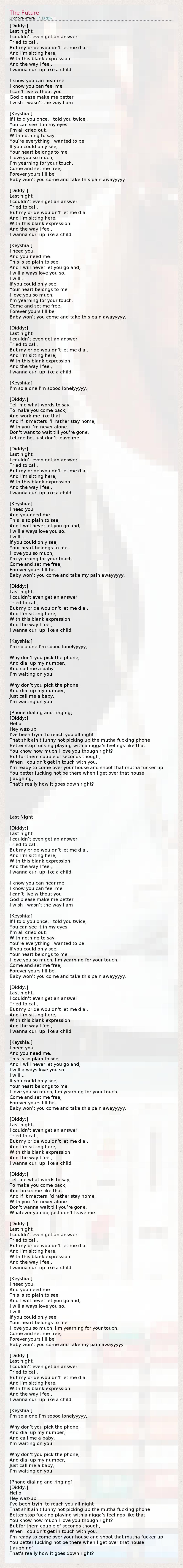 [Diddy:] Last night, I couldn't even get an answer. Tried to call, But my pride wouldn't let me dial. And I'm sitting here, With this blank expression. And the way I feel, I wanna curl up like a child. I know you can hear me I know you can feel me I can't live without you God please make me better I wish I wasn't the way I am [Keyshia:] If I told you once, I told you twice, You can see it in my eyes. I'm all cried out, With nothing to say. You're everything I wanted to be. If you could only see, Your heart belongs to me. I love you so much, I'm yearning for your touch. Come and set me free, Forever yours I'll be, Baby won't you come and take this pain awayyyyy. [Diddy:] Last night, I couldn't even get an answer. Tried to call, But my pride wouldn't let me dial. And I'm sitting here, With this blank expression. And the way I feel, I wanna curl up like a child. [Keyshia:] I need you, And you need me. This is so plain to see, And I will never let you go and, I will always love you so. I will... If you could only see, Your heart belongs to me. I love you so much, I'm yearning for your touch. Come and set me free, Forever yours I'll be, Baby won't you come and take this pain awayyyyy. [Diddy:] Last night, I couldn't even get an answer. Tried to call, But my pride wouldn't let me dial. And I'm sitting here, With this blank expression. And the way I feel, I wanna curl up like a child. [Keyshia:] I'm so alone I'm soooo lonelyyyyy, [Diddy:] Tell me what words to say, To make you come back, And work me like that. And if it matters I'll rather stay home, With you I'm never alone. Don't want to wait till you're gone, Let me be, just don't leave me. [Diddy:] Last night, I couldn't even get an answer. Tried to call, But my pride wouldn't let me dial. And I'm sitting here, With this blank expression. And the way I feel, I wanna curl up like a child. [Keyshia:] I need you, And you need me. This is so plain to see, And I will never let you go and, I will always love you so. I will... If you could only see, Your heart belongs to me. I love you so much, I'm yearning for your touch. Come and set me free, Forever yours I'll be, Baby won't you come and take my pain awayyyyy. [Diddy:] Last night, I couldn't even get an answer. Tried to call, But my pride wouldn't let me dial. And I'm sitting here, With this blank expression. And the way I feel, I wanna curl up like a child. [Keyshia:] I'm so alone I'm soooo lonelyyyyy, Why don't you pick the phone, And dial up my number, And call me a baby, I'm waiting on you. Why don't you pick the phone, And dial up my number, Just call me a baby, I'm waiting on you. [Phone dialing and ringing] [Diddy:] Hello Hey waz-up I've been tryin' to reach you all night That shit ain't funny not picking up the mutha fucking phone Better stop fucking playing with a nigga's feelings like that You know how much I love you though right? But for them couple of seconds though, When I couldn't get in touch with you. I'm ready to come over your house and shoot that mutha fucker up You better fucking not be there when I get over that house [laughing] That's really how it goes down right? Last Night [Diddy:] Last night, I couldn't even get an answer. Tried to call, But my pride wouldn't let me dial. And I'm sitting here, With this blank expression. And the way I feel, I wanna curl up like a child. I know you can hear me I know you can feel me I can't live without you God please make me better I wish I wasn't the way I am [Keyshia:] If I told you once, I told you twice, You can see it in my eyes. I'm all cried out, With nothing to say. You're everything I wanted to be. If you could only see, Your heart belongs to me. I love you so much, I'm yearning for your touch. Come and set me free, Forever yours I'll be, Baby won't you come and take this pain awayyyyy. [Diddy:] Last night, I couldn't even get an answer. Tried to call, But my pride wouldn't let me dial. And I'm sitting here, With this blank expression. And the way I feel, I wanna curl up like a child. [Keyshia:] I need you, And you need me. This is so plain to see, And I will never let you go and, I will always love you so. I will... If you could only see, Your heart belongs to me. I love you so much, I'm yearning for your touch. Come and set me free, Forever yours I'll be, Baby won't you come and take this pain awayyyyy. [Diddy:] Last night, I couldn't even get an answer. Tried to call, But my pride wouldn't let me dial. And I'm sitting here, With this blank expression. And the way I feel, I wanna curl up like a child. [Diddy:] Tell me what words to say, To make you come back, And break me like that. And if it matters I'd rather stay home, With you I'm never alone. Don't wanna wait till you're gone, Whatever you do, just don't leave me. [Diddy:] Last night, I couldn't even get an answer. Tried to call, But my pride wouldn't let me dial. And I'm sitting here, With this blank expression. And the way I feel, I wanna curl up like a child. [Keyshia:] I need you, And you need me. This is so plain to see, And I will never let you go and, I will always love you so. I will... If you could only see, Your heart belongs to me. I love you so much, I'm yearning for your touch. Come and set me free, Forever yours I'll be, Baby won't you come and take my pain awayyyyy. [Diddy:] Last night, I couldn't even get an answer. Tried to call, But my pride wouldn't let me dial. And I'm sitting here, With this blank expression. And the way I feel, I wanna curl up like a child. [Keyshia:] I'm so alone I'm soooo lonelyyyyy, Why don't you pick the phone, And dial up my number, And call me a baby, I'm waiting on you. Why don't you pick the phone, And dial up my number, Just call me a baby, I'm waiting on you. [Phone dialing and ringing] [Diddy:] Hello Hey waz-up I've been tryin' to reach you all night That shit ain't funny not picking up the mutha fucking phone Better stop fucking playing with a nigga's feelings like that You know how much I love you though right? But fo
