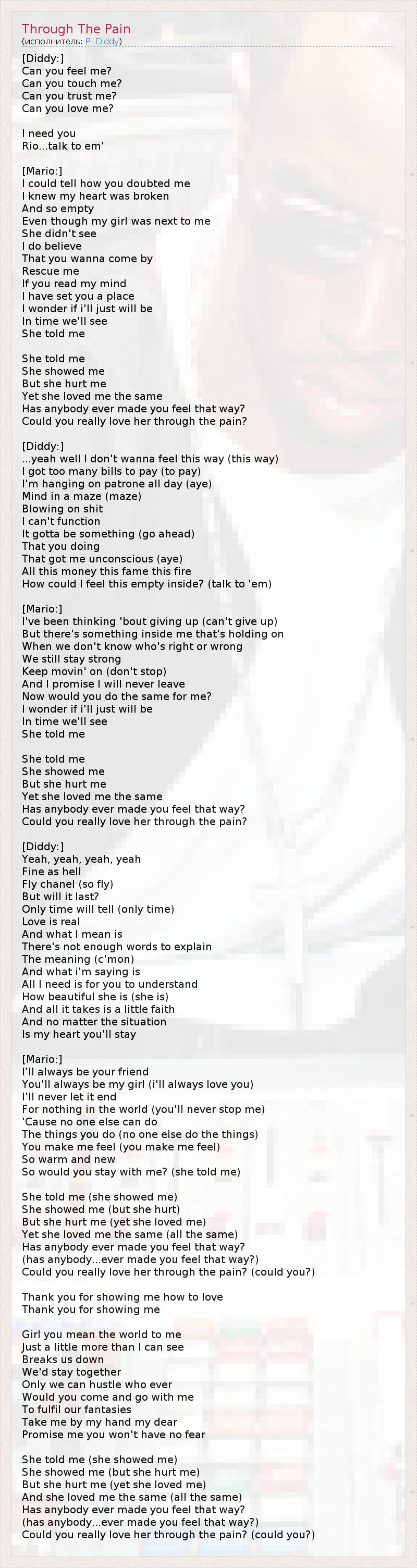 [Diddy:] Can you feel me? Can you touch me? Can you trust me? Can you love me? I need you Rio...talk to em' [Mario:] I could tell how you doubted me I knew my heart was broken And so empty Even though my girl was next to me She didn't see I do believe That you wanna come by Rescue me If you read my mind I have set you a place I wonder if i'll just will be In time we'll see She told me She told me She showed me But she hurt me Yet she loved me the same Has anybody ever made you feel that way? Could you really love her through the pain? [Diddy:] ...yeah well I don't wanna feel this way (this way) I got too many bills to pay (to pay) I'm hanging on patrone all day (aye) Mind in a maze (maze) Blowing on shit I can't function It gotta be something (go ahead) That you doing That got me unconscious (aye) All this money this fame this fire How could I feel this empty inside? (talk to 'em) [Mario:] I've been thinking 'bout giving up (can't give up) But there's something inside me that's holding on When we don't know who's right or wrong We still stay strong Keep movin' on (don't stop) And I promise I will never leave Now would you do the same for me? I wonder if i'll just will be In time we'll see She told me She told me She showed me But she hurt me Yet she loved me the same Has anybody ever made you feel that way? Could you really love her through the pain? [Diddy:] Yeah, yeah, yeah, yeah Fine as hell Fly chanel (so fly) But will it last? Only time will tell (only time) Love is real And what I mean is There's not enough words to explain The meaning (c'mon) And what i'm saying is All I need is for you to understand How beautiful she is (she is) And all it takes is a little faith And no matter the situation Is my heart you'll stay [Mario:] I'll always be your friend You'll always be my girl (i'll always love you) I'll never let it end For nothing in the world (you'll never stop me) 'Cause no one else can do The things you do (no one else do the things) You make me feel (you make me feel) So warm and new So would you stay with me? (she told me) She told me (she showed me) She showed me (but she hurt) But she hurt me (yet she loved me) Yet she loved me the same (all the same) Has anybody ever made you feel that way? (has anybody...ever made you feel that way?) Could you really love her through the pain? (could you?) Thank you for showing me how to love Thank you for showing me Girl you mean the world to me Just a little more than I can see Breaks us down We'd stay together Only we can hustle who ever Would you come and go with me To fulfil our fantasies Take me by my hand my dear Promise me you won't have no fear She told me (she showed me) She showed me (but she hurt me) But she hurt me (yet she loved me) And she loved me the same (all the same) Has anybody ever made you feel that way? (has anybody...ever made you feel that way?) Could you really love her through the pain? (could you?)