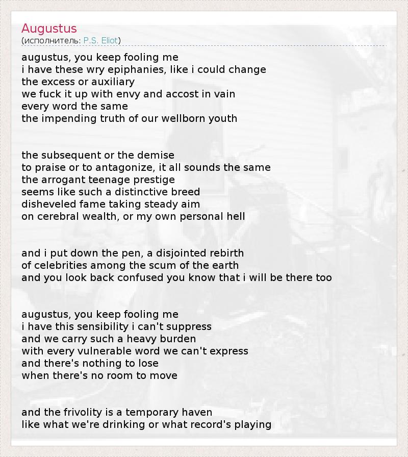 augustus, you keep fooling me i have these wry epiphanies, like i could change the excess or auxiliary we fuck it up with envy and accost in vain every word the same the impending truth of our wellborn youth the subsequent or the demise to praise or to antagonize, it all sounds the same the arrogant teenage prestige seems like such a distinctive breed disheveled fame taking steady aim on cerebral wealth, or my own personal hell and i put down the pen, a disjointed rebirth of celebrities among the scum of the earth and you look back confused you know that i will be there too augustus, you keep fooling me i have this sensibility i can't suppress and we carry such a heavy burden with every vulnerable word we can't express and there's nothing to lose when there's no room to move and the frivolity is a temporary haven like what we're drinking or what record's playing