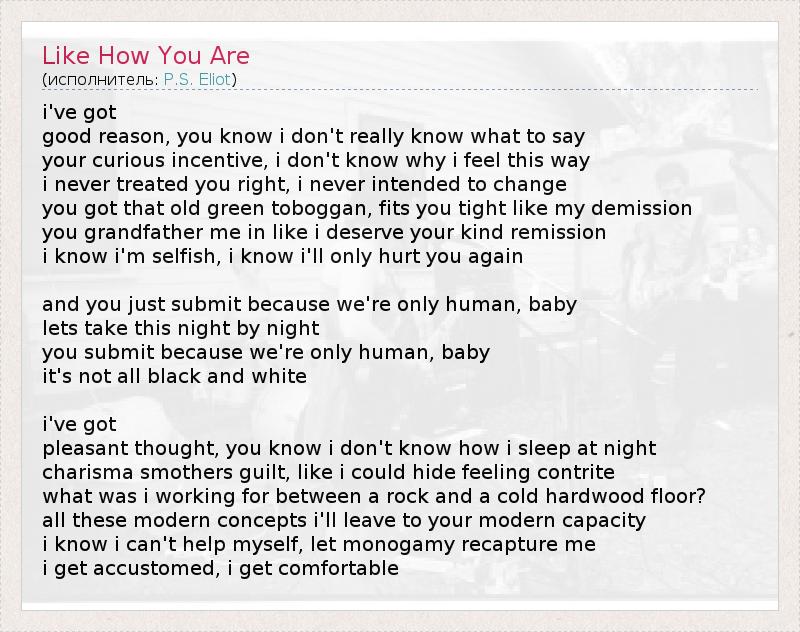 у меня есть хорошая причина , вы знаете, я действительно не знаю, что сказать ваш любопытный стимул , я не знаю, почему я чувствую этот путь я никогда не относился вам прямо , я никогда не намеревался изменить Вы получили эту старую зеленую сани , подходит вам туго , как мой отставке Вы дед меня в как я заслуживаю вашего доброго ремиссии Я знаю, что эгоистично , я знаю, я буду только повредит вам снова и вы просто представить , потому что мы всего лишь человек , ребенок давайте эту ночь ночью Вы представить , потому что мы всего лишь человек , ребенок это еще не все черно-белые у меня есть приятная мысль , вы знаете, я не знаю, как я спать по ночам харизма душит вину , как я мог скрыть чувство сокрушенным О чем я работал между молотом и холодной паркете ? все эти современные концепции я оставлю в свой современный мощностью я знаю, что не могу с собой поделать , пусть моногамия вернуть меня я приглядеться , я освоиться