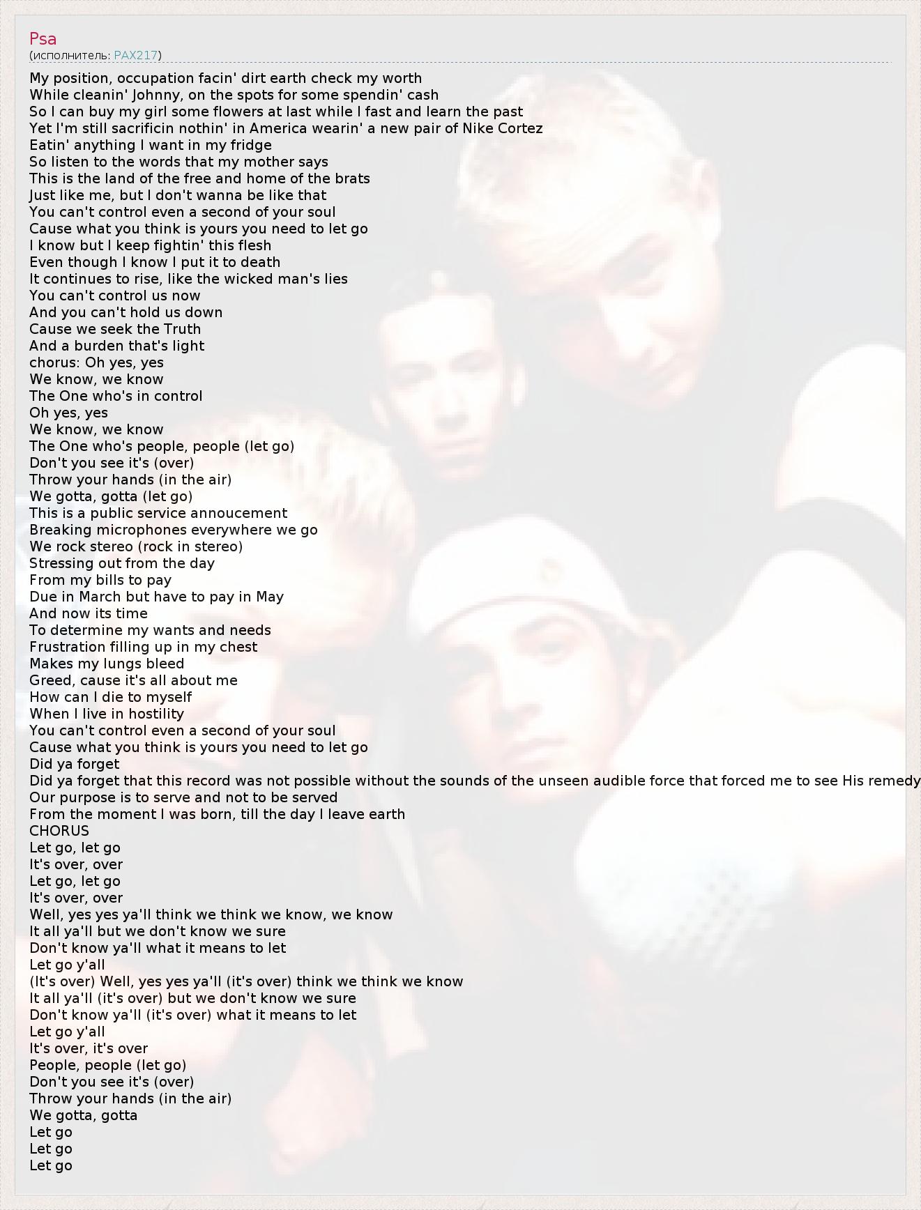 Это интересно:“Мы играем музыку для всех, будь то белый, коричневый или черный слушатель. Мы играем и для христиан, и для евреев, и для мусульман, и для буддистов. Это и есть наша концепция – послание миру, говорящее о любви через музыку и взаимодействии с людьми через наши концерты”.Бобби “Шеф Боббито” Дюран Группа Pax217 была образованна в 1995-м в Калифорнии, когда почти все члены коллектива... продолжение