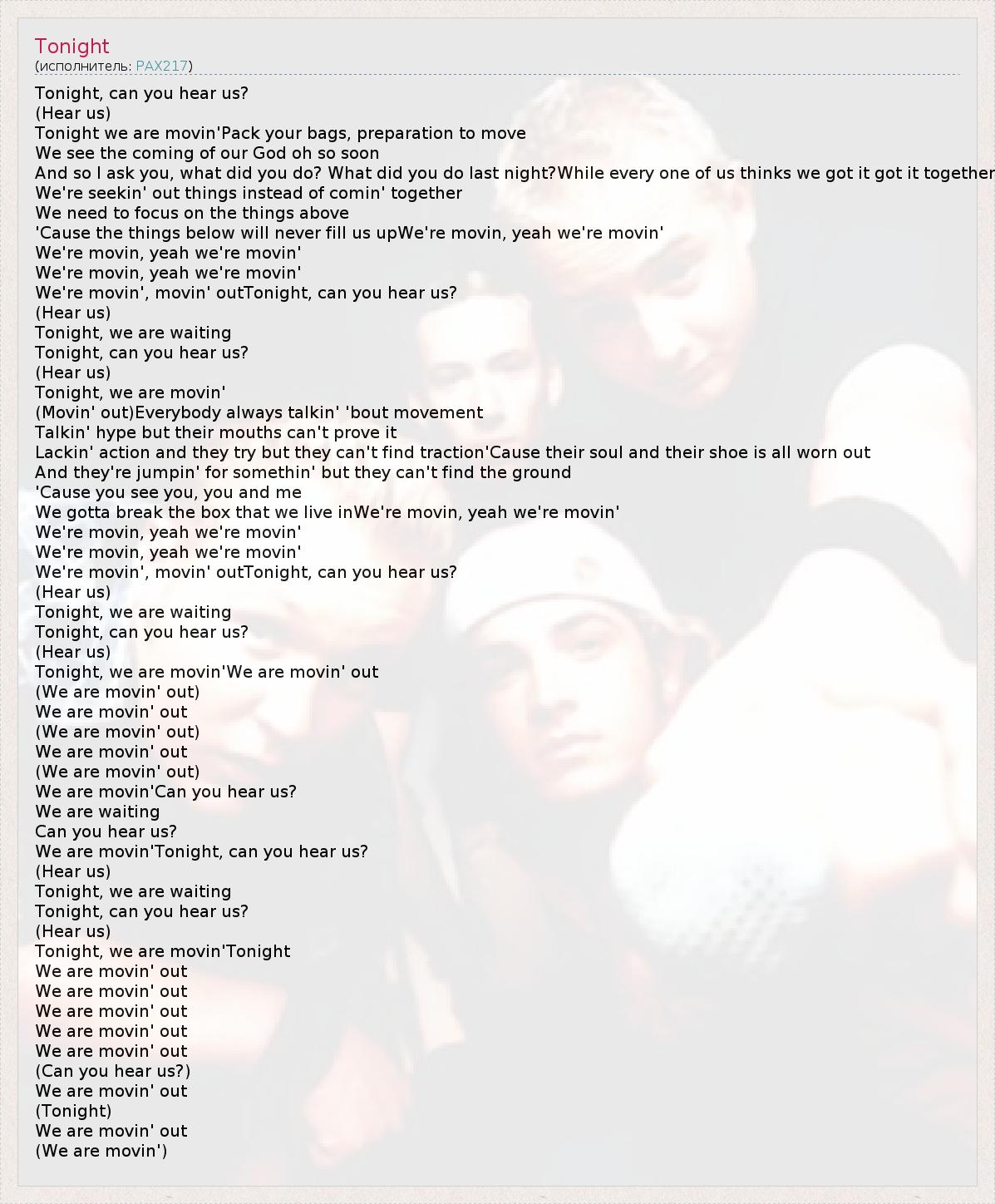 Tonight, can you hear us? (Hear us) Tonight we are movin'Pack your bags, preparation to move We see the coming of our God oh so soon And so I ask you, what did you do? What did you do last night?While every one of us thinks we got it got it together We're seekin' out things instead of comin' together We need to focus on the things above 'Cause the things below will never fill us upWe're movin, yeah we're movin' We're movin, yeah we're movin' We're movin, yeah we're movin' We're movin', movin' outTonight, can you hear us? (Hear us) Tonight, we are waiting Tonight, can you hear us? (Hear us) Tonight, we are movin' (Movin' out)Everybody always talkin' 'bout movement Talkin' hype but their mouths can't prove it Lackin' action and they try but they can't find traction'Cause their soul and their shoe is all worn out And they're jumpin' for somethin' but they can't find the ground 'Cause you see you, you and me We gotta break the box that we live inWe're movin, yeah we're movin' We're movin, yeah we're movin' We're movin, yeah we're movin' We're movin', movin' outTonight, can you hear us? (Hear us) Tonight, we are waiting Tonight, can you hear us? (Hear us) Tonight, we are movin'We are movin' out (We are movin' out) We are movin' out (We are movin' out) We are movin' out (We are movin' out) We are movin'Can you hear us? We are waiting Can you hear us? We are movin'Tonight, can you hear us? (Hear us) Tonight, we are waiting Tonight, can you hear us? (Hear us) Tonight, we are movin'Tonight We are movin' out We are movin' out We are movin' out We are movin' out We are movin' out (Can you hear us?) We are movin' out (Tonight) We are movin' out (We are movin')