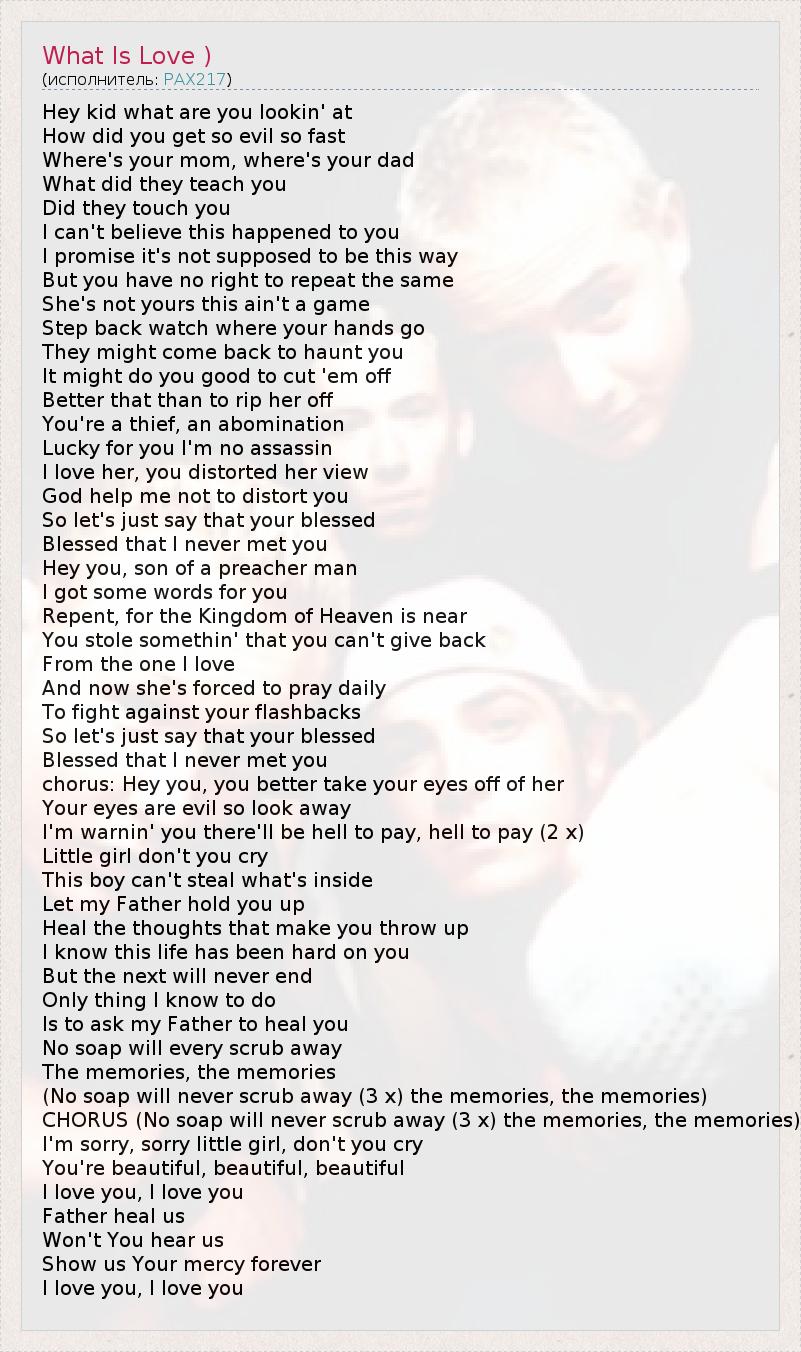Hey kid what are you lookin' at How did you get so evil so fast Where's your mom, where's your dad What did they teach you Did they touch you I can't believe this happened to you I promise it's not supposed to be this way But you have no right to repeat the same She's not yours this ain't a game Step back watch where your hands go They might come back to haunt you It might do you good to cut 'em off Better that than to rip her off You're a thief, an abomination Lucky for you I'm no assassin I love her, you distorted her view God help me not to distort you So let's just say that your blessed Blessed that I never met you Hey you, son of a preacher man I got some words for you Repent, for the Kingdom of Heaven is near You stole somethin' that you can't give back From the one I love And now she's forced to pray daily To fight against your flashbacks So let's just say that your blessed Blessed that I never met you chorus: Hey you, you better take your eyes off of her Your eyes are evil so look away I'm warnin' you there'll be hell to pay, hell to pay (2 x) Little girl don't you cry This boy can't steal what's inside Let my Father hold you up Heal the thoughts that make you throw up I know this life has been hard on you But the next will never end Only thing I know to do Is to ask my Father to heal you No soap will every scrub away The memories, the memories (No soap will never scrub away (3 x) the memories, the memories) CHORUS (No soap will never scrub away (3 x) the memories, the memories) I'm sorry, sorry little girl, don't you cry You're beautiful, beautiful, beautiful I love you, I love you Father heal us Won't You hear us Show us Your mercy forever I love you, I love you