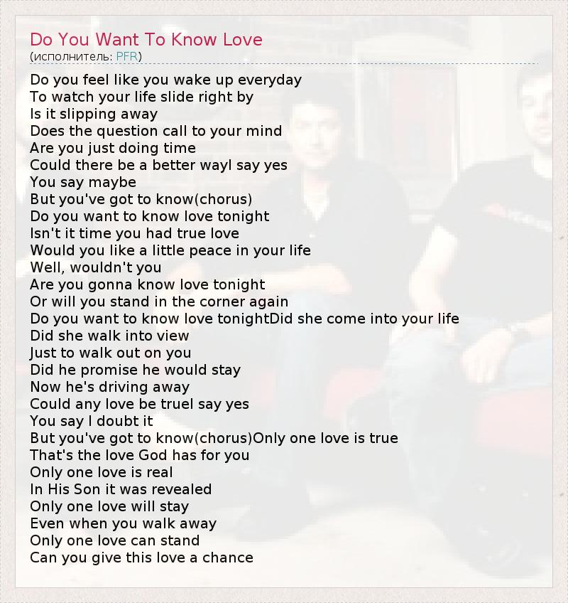 Do you feel like you wake up everyday To watch your life slide right by Is it slipping away Does the question call to your mind Are you just doing time Could there be a better wayI say yes You say maybe But you've got to know(chorus) Do you want to know love tonight Isn't it time you had true love Would you like a little peace in your life Well, wouldn't you Are you gonna know love tonight Or will you stand in the corner again Do you want to know love tonightDid she come into your life Did she walk into view Just to walk out on you Did he promise he would stay Now he's driving away Could any love be trueI say yes You say I doubt it But you've got to know(chorus)Only one love is true That's the love God has for you Only one love is real In His Son it was revealed Only one love will stay Even when you walk away Only one love can stand Can you give this love a chance