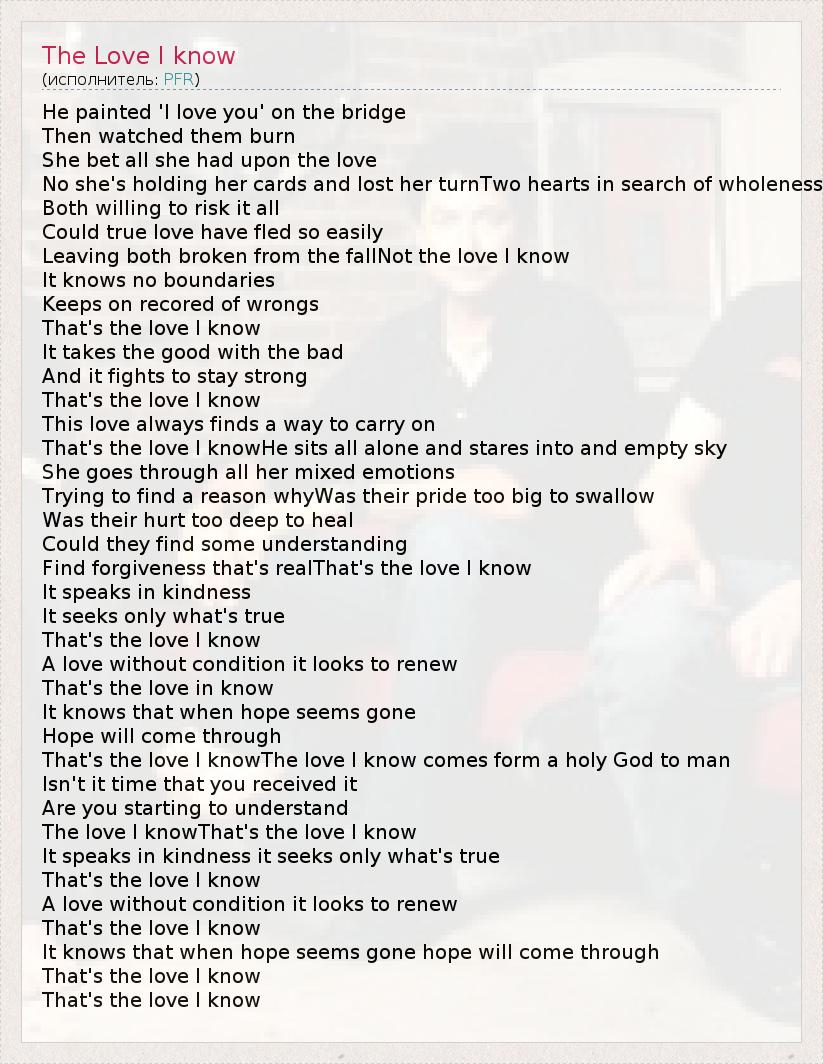He painted 'I love you' on the bridge Then watched them burn She bet all she had upon the love No she's holding her cards and lost her turnTwo hearts in search of wholeness Both willing to risk it all Could true love have fled so easily Leaving both broken from the fallNot the love I know It knows no boundaries Keeps on recored of wrongs That's the love I know It takes the good with the bad And it fights to stay strong That's the love I know This love always finds a way to carry on That's the love I knowHe sits all alone and stares into and empty sky She goes through all her mixed emotions Trying to find a reason whyWas their pride too big to swallow Was their hurt too deep to heal Could they find some understanding Find forgiveness that's realThat's the love I know It speaks in kindness It seeks only what's true That's the love I know A love without condition it looks to renew That's the love in know It knows that when hope seems gone Hope will come through That's the love I knowThe love I know comes form a holy God to man Isn't it time that you received it Are you starting to understand The love I knowThat's the love I know It speaks in kindness it seeks only what's true That's the love I know A love without condition it looks to renew That's the love I know It knows that when hope seems gone hope will come through That's the love I know That's the love I know