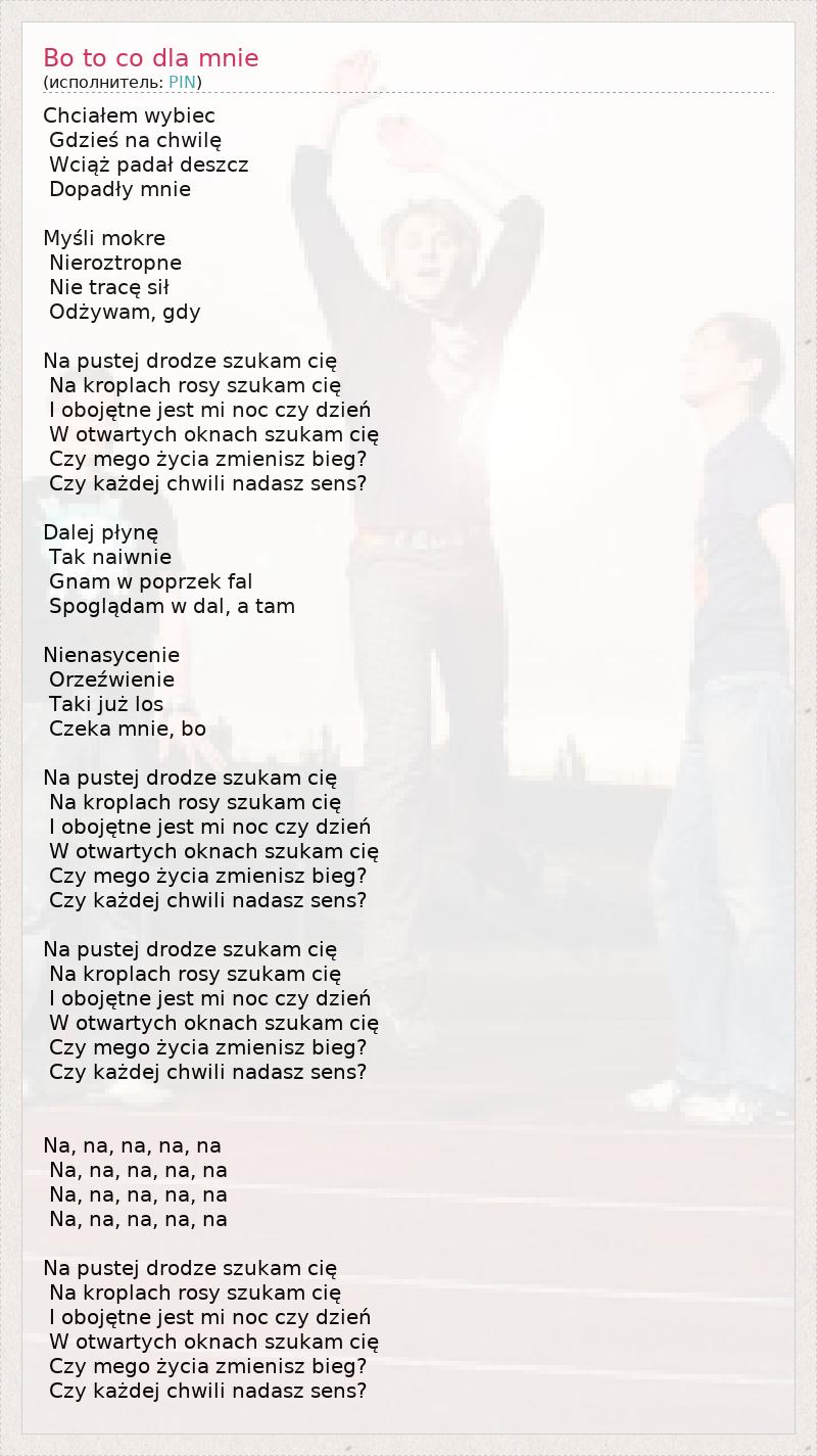Chciałem wybiec Gdzieś на chwilę Wciąż padał deszcz Dopadły mnie Мысли Мокре Nieroztropne Nie проследить SIL Odżywam, гды На pustej drodze szukam Cie Na kroplach радужно szukam Cie Я obojętne шутка миль НОК Czy dzień Вт otwartych oknach szukam Cie Czy Mego życia zmienisz Bieg? Czy każdej chwili nadasz Sens? Dalej płynę Так naiwnie Gnam ж poprzek FAL Spoglądam ж дал, ТАМ Nienasycenie Orzeźwienie Таки już лос Czeka mnie, бо На pustej drodze szukam Cie Na kroplach радужно szukam Cie Я obojętne шутка миль НОК Czy dzień Вт otwartych oknach szukam Cie Czy Mego życia zmienisz Bieg? Czy każdej chwili nadasz Sens? На pustej drodze szukam Cie Na kroplach радужно szukam Cie Я obojętne шутка миль НОК Czy dzień Вт otwartych oknach szukam Cie Czy Mego życia zmienisz Bieg? Czy każdej chwili nadasz Sens? Na, на, на, на, на Na, на, на, на, на Na, на, на, на, на Na, на, на, на, на На pustej drodze szukam Cie Na kroplach радужно szukam Cie Я obojętne шутка миль НОК Czy dzień Вт otwartych oknach szukam Cie Czy Mego życia zmienisz Bieg? Czy każdej chwili nadasz Sens?