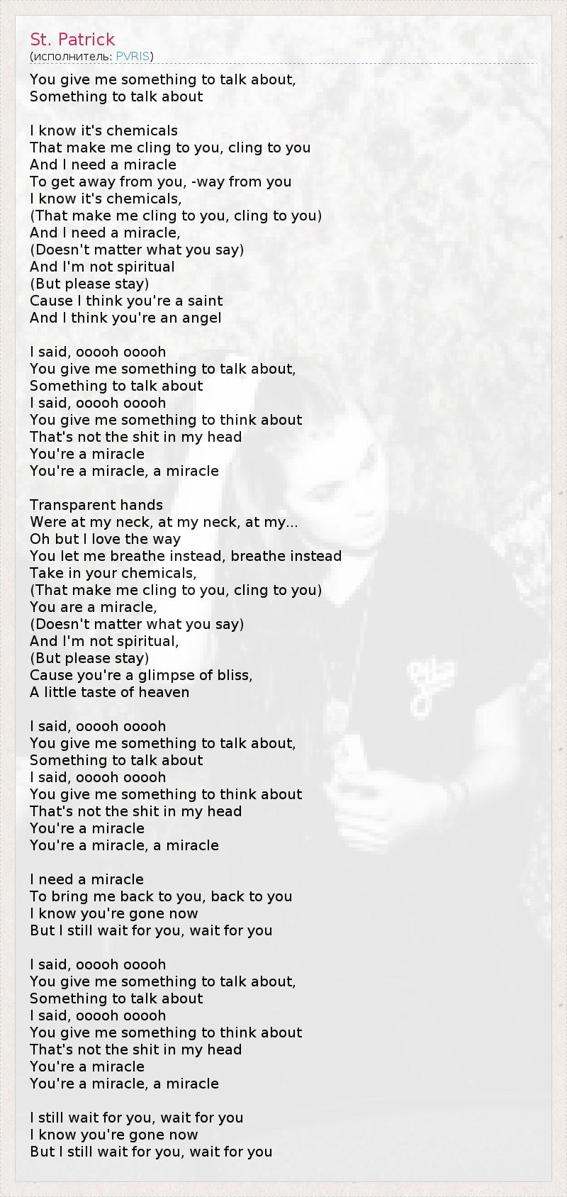 You give me something to talk about, Something to talk about I know it's chemicals That make me cling to you, cling to you And I need a miracle To get away from you, -way from you I know it's chemicals, (That make me cling to you, cling to you) And I need a miracle, (Doesn't matter what you say) And I'm not spiritual (But please stay) Cause I think you're a saint And I think you're an angel I said, ooooh ooooh You give me something to talk about, Something to talk about I said, ooooh ooooh You give me something to think about That's not the shit in my head You're a miracle You're a miracle, a miracle Transparent hands Were at my neck, at my neck, at my... Oh but I love the way You let me breathe instead, breathe instead Take in your chemicals, (That make me cling to you, cling to you) You are a miracle, (Doesn't matter what you say) And I'm not spiritual, (But please stay) Cause you're a glimpse of bliss, A little taste of heaven I said, ooooh ooooh You give me something to talk about, Something to talk about I said, ooooh ooooh You give me something to think about That's not the shit in my head You're a miracle You're a miracle, a miracle I need a miracle To bring me back to you, back to you I know you're gone now But I still wait for you, wait for you I said, ooooh ooooh You give me something to talk about, Something to talk about I said, ooooh ooooh You give me something to think about That's not the shit in my head You're a miracle You're a miracle, a miracle I still wait for you, wait for you I know you're gone now But I still wait for you, wait for you