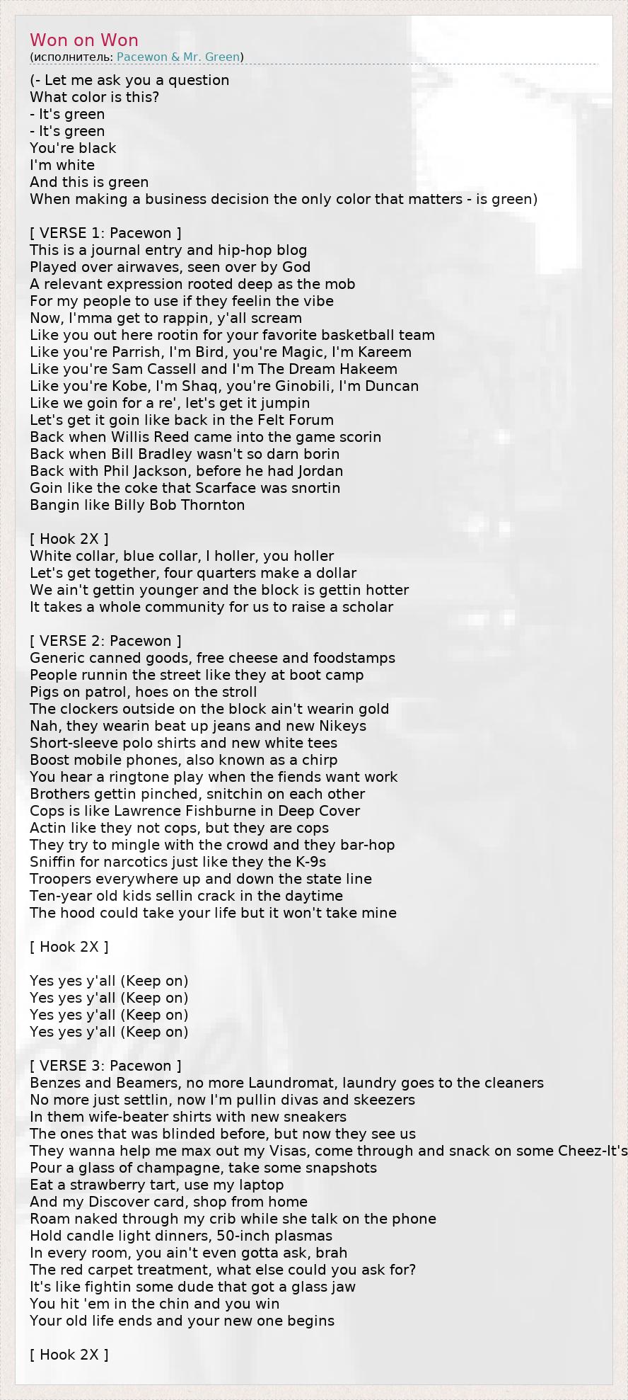 (- Let me ask you a question What color is this? - It's green - It's green You're black I'm white And this is green When making a business decision the only color that matters - is green) [ VERSE 1: Pacewon ] This is a journal entry and hip-hop blog Played over airwaves, seen over by God A relevant expression rooted deep as the mob For my people to use if they feelin the vibe Now, I'mma get to rappin, y'all scream Like you out here rootin for your favorite basketball team Like you're Parrish, I'm Bird, you're Magic, I'm Kareem Like you're Sam Cassell and I'm The Dream Hakeem Like you're Kobe, I'm Shaq, you're Ginobili, I'm Duncan Like we goin for a re', let's get it jumpin Let's get it goin like back in the Felt Forum Back when Willis Reed came into the game scorin Back when Bill Bradley wasn't so darn borin Back with Phil Jackson, before he had Jordan Goin like the coke that Scarface was snortin Bangin like Billy Bob Thornton [ Hook 2X ] White collar, blue collar, I holler, you holler Let's get together, four quarters make a dollar We ain't gettin younger and the block is gettin hotter It takes a whole community for us to raise a scholar [ VERSE 2: Pacewon ] Generic canned goods, free cheese and foodstamps People runnin the street like they at boot camp Pigs on patrol, hoes on the stroll The clockers outside on the block ain't wearin gold Nah, they wearin beat up jeans and new Nikeys Short-sleeve polo shirts and new white tees Boost mobile phones, also known as a chirp You hear a ringtone play when the fiends want work Brothers gettin pinched, snitchin on each other Cops is like Lawrence Fishburne in Deep Cover Actin like they not cops, but they are cops They try to mingle with the crowd and they bar-hop Sniffin for narcotics just like they the K-9s Troopers everywhere up and down the state line Ten-year old kids sellin crack in the daytime The hood could take your life but it won't take mine [ Hook 2X ] Yes yes y'all (Keep on) Yes yes y'all (Keep on) Yes yes y'all (Keep on) Yes yes y'all (Keep on) [ VERSE 3: Pacewon ] Benzes and Beamers, no more Laundromat, laundry goes to the cleaners No more just settlin, now I'm pullin divas and skeezers In them wife-beater shirts with new sneakers The ones that was blinded before, but now they see us They wanna help me max out my Visas, come through and snack on some Cheez-It's Pour a glass of champagne, take some snapshots Eat a strawberry tart, use my laptop And my Discover card, shop from home Roam naked through my crib while she talk on the phone Hold candle light dinners, 50-inch plasmas In every room, you ain't even gotta ask, brah The red carpet treatment, what else could you ask for? It's like fightin some dude that got a glass jaw You hit 'em in the chin and you win Your old life ends and your new one begins [ Hook 2X ]