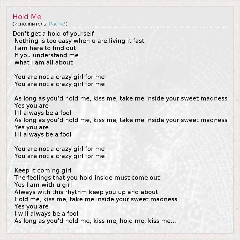 Don't get a hold of yourself Nothing is too easy when u are living it fast I am here to find out If you understand me what I am all about You are not a crazy girl for me You are not a crazy girl for me As long as you'd hold me, kiss me, take me inside your sweet madness Yes you are I'll always be a fool As long as you'd hold me, kiss me, take me inside your sweet madness Yes you are I'll always be a fool You are not a crazy girl for me You are not a crazy girl for me Keep it coming girl The feelings that you hold inside must come out Yes I am with u girl Always with this rhythm keep you up and about Hold me, kiss me, take me inside your sweet madness Yes you are I will always be a fool As long as you'd hold me, kiss me, hold me, kiss me....