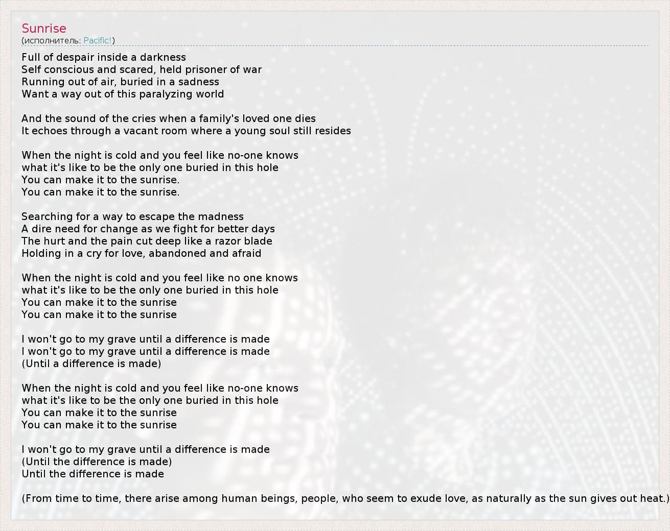 Full of despair inside a darkness Self conscious and scared, held prisoner of war Running out of air, buried in a sadness Want a way out of this paralyzing world And the sound of the cries when a family's loved one dies It echoes through a vacant room where a young soul still resides When the night is cold and you feel like no-one knows what it's like to be the only one buried in this hole You can make it to the sunrise. You can make it to the sunrise. Searching for a way to escape the madness A dire need for change as we fight for better days The hurt and the pain cut deep like a razor blade Holding in a cry for love, abandoned and afraid When the night is cold and you feel like no one knows what it's like to be the only one buried in this hole You can make it to the sunrise You can make it to the sunrise I won't go to my grave until a difference is made I won't go to my grave until a difference is made (Until a difference is made) When the night is cold and you feel like no-one knows what it's like to be the only one buried in this hole You can make it to the sunrise You can make it to the sunrise I won't go to my grave until a difference is made (Until the difference is made) Until the difference is made (From time to time, there arise among human beings, people, who seem to exude love, as naturally as the sun gives out heat.)