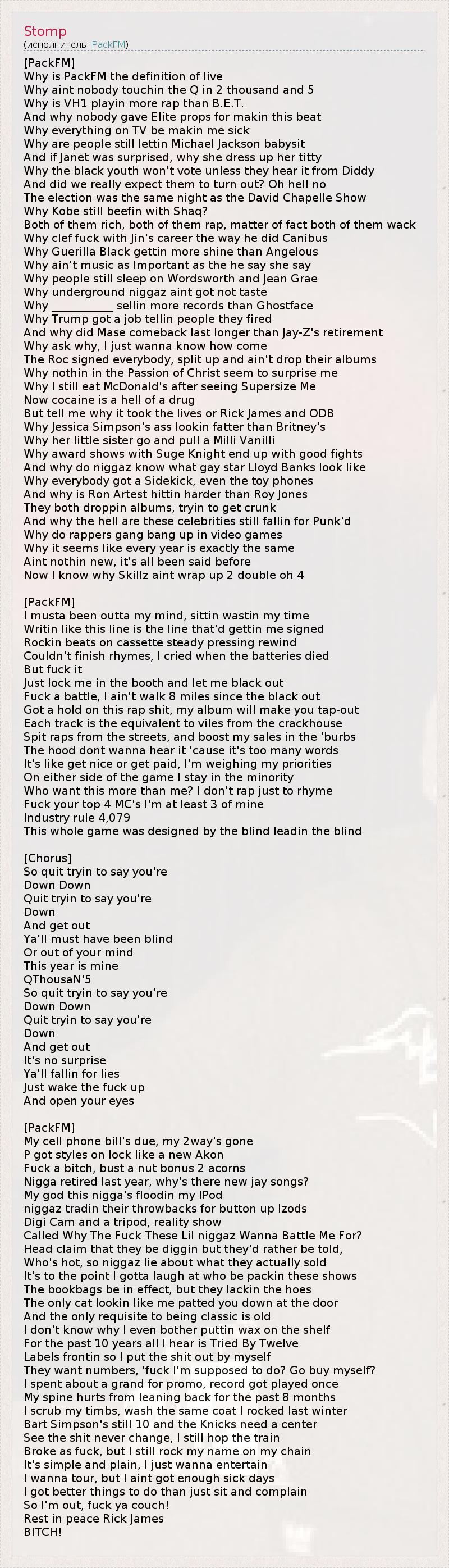 [PackFM] Why is PackFM the definition of live Why aint nobody touchin the Q in 2 thousand and 5 Why is VH1 playin more rap than B.E.T. And why nobody gave Elite props for makin this beat Why everything on TV be makin me sick Why are people still lettin Michael Jackson babysit And if Janet was surprised, why she dress up her titty Why the black youth won't vote unless they hear it from Diddy And did we really expect them to turn out? Oh hell no The election was the same night as the David Chapelle Show Why Kobe still beefin with Shaq? Both of them rich, both of them rap, matter of fact both of them wack Why clef fuck with Jin's career the way he did Canibus Why Guerilla Black gettin more shine than Angelous Why ain't music as Important as the he say she say Why people still sleep on Wordsworth and Jean Grae Why underground niggaz aint got not taste Why ___________ sellin more records than Ghostface Why Trump got a job tellin people they fired And why did Mase comeback last longer than Jay-Z's retirement Why ask why, I just wanna know how come The Roc signed everybody, split up and ain't drop their albums Why nothin in the Passion of Christ seem to surprise me Why I still eat McDonald's after seeing Supersize Me Now cocaine is a hell of a drug But tell me why it took the lives or Rick James and ODB Why Jessica Simpson's ass lookin fatter than Britney's Why her little sister go and pull a Milli Vanilli Why award shows with Suge Knight end up with good fights And why do niggaz know what gay star Lloyd Banks look like Why everybody got a Sidekick, even the toy phones And why is Ron Artest hittin harder than Roy Jones They both droppin albums, tryin to get crunk And why the hell are these celebrities still fallin for Punk'd Why do rappers gang bang up in video games Why it seems like every year is exactly the same Aint nothin new, it's all been said before Now I know why Skillz aint wrap up 2 double oh 4 [PackFM] I musta been outta my mind, sittin wastin my time Writin like this line is the line that'd gettin me signed Rockin beats on cassette steady pressing rewind Couldn't finish rhymes, I cried when the batteries died But fuck it Just lock me in the booth and let me black out Fuck a battle, I ain't walk 8 miles since the black out Got a hold on this rap shit, my album will make you tap-out Each track is the equivalent to viles from the crackhouse Spit raps from the streets, and boost my sales in the 'burbs The hood dont wanna hear it 'cause it's too many words It's like get nice or get paid, I'm weighing my priorities On either side of the game I stay in the minority Who want this more than me? I don't rap just to rhyme Fuck your top 4 MC's I'm at least 3 of mine Industry rule 4,079 This whole game was designed by the blind leadin the blind [Chorus] So quit tryin to say you're Down Down Quit tryin to say you're Down And get out Ya'll must have been blind Or out of your mind This year is mine QThousaN'5 So quit tryin to say you're Down Down Quit tryin to say you're Down And get out It's no surprise Ya'll fallin for lies Just wake the fuck up And open your eyes [PackFM] My cell phone bill's due, my 2way's gone P got styles on lock like a new Akon Fuck a bitch, bust a nut bonus 2 acorns Nigga retired last year, why's there new jay songs? My god this nigga's floodin my IPod niggaz tradin their throwbacks for button up Izods Digi Cam and a tripod, reality show Called Why The Fuck These Lil niggaz Wanna Battle Me For? Head claim that they be diggin but they'd rather be told, Who's hot, so niggaz lie about what they actually sold It's to the point I gotta laugh at who be packin these shows The bookbags be in effect, but they lackin the hoes The only cat lookin like me patted you down at the door And the only requisite to being classic is old I don't know why I even bother puttin wax on the shelf For the past 10 years all I hear is Tried By Twelve Labels frontin so I put the shit out by myself They want numbers, 'fuck I'm supposed to do? Go buy myself? I spent about a grand for promo, record got played once My spine hurts from leaning back for the past 8 months I scrub my timbs, wash the same coat I rocked last winter Bart Simpson's still 10 and the Knicks need a center See the shit never change, I still hop the train Broke as fuck, but I still rock my name on my chain It's simple and plain, I just wanna entertain I wanna tour, but I aint got enough sick days I got better things to do than just sit and complain So I'm out, fuck ya couch! Rest in peace Rick James BITCH!