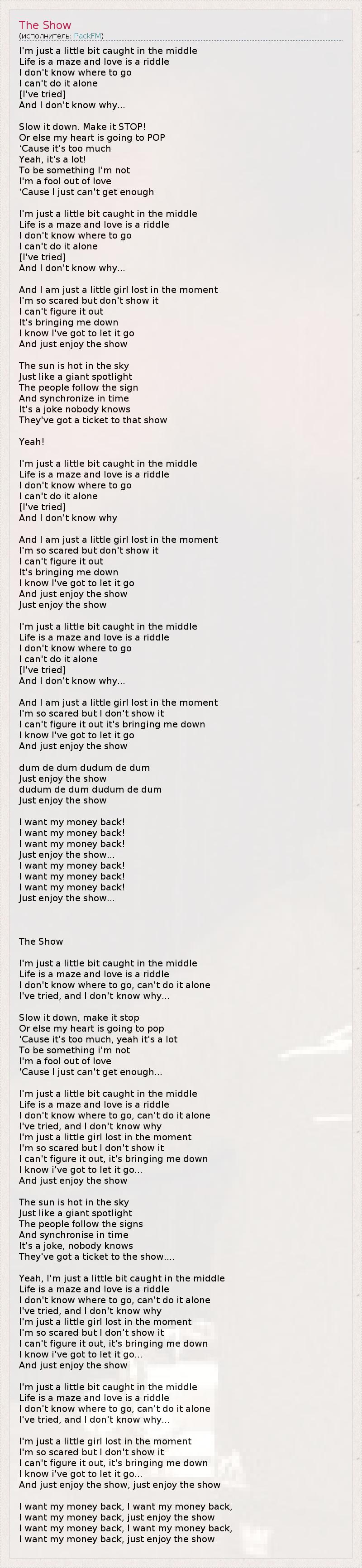 I'm just a little bit caught in the middle Life is a maze and love is a riddle I don't know where to go I can't do it alone [I've tried] And I don't know why... Slow it down. Make it STOP! Or else my heart is going to POP ‘Cause it's too much Yeah, it's a lot! To be something I'm not I'm a fool out of love ‘Cause I just can't get enough I'm just a little bit caught in the middle Life is a maze and love is a riddle I don't know where to go I can't do it alone [I've tried] And I don't know why... And I am just a little girl lost in the moment I'm so scared but don't show it I can't figure it out It's bringing me down I know I've got to let it go And just enjoy the show The sun is hot in the sky Just like a giant spotlight The people follow the sign And synchronize in time It's a joke nobody knows They've got a ticket to that show Yeah! I'm just a little bit caught in the middle Life is a maze and love is a riddle I don't know where to go I can't do it alone [I've tried] And I don't know why And I am just a little girl lost in the moment I'm so scared but don't show it I can't figure it out It's bringing me down I know I've got to let it go And just enjoy the show Just enjoy the show I'm just a little bit caught in the middle Life is a maze and love is a riddle I don't know where to go I can't do it alone [I've tried] And I don't know why... And I am just a little girl lost in the moment I'm so scared but I don't show it I can't figure it out it's bringing me down I know I've got to let it go And just enjoy the show dum de dum dudum de dum Just enjoy the show dudum de dum dudum de dum Just enjoy the show I want my money back! I want my money back! I want my money back! Just enjoy the show... I want my money back! I want my money back! I want my money back! Just enjoy the show... The Show I'm just a little bit caught in the middle Life is a maze and love is a riddle I don't know where to go, can't do it alone I've tried, and I don't know why... Slow it down, make it stop Or else my heart is going to pop 'Cause it's too much, yeah it's a lot To be something i'm not I'm a fool out of love 'Cause I just can't get enough... I'm just a little bit caught in the middle Life is a maze and love is a riddle I don't know where to go, can't do it alone I've tried, and I don't know why I'm just a little girl lost in the moment I'm so scared but I don't show it I can't figure it out, it's bringing me down I know i've got to let it go... And just enjoy the show The sun is hot in the sky Just like a giant spotlight The people follow the signs And synchronise in time It's a joke, nobody knows They've got a ticket to the show.... Yeah, I'm just a little bit caught in the middle Life is a maze and love is a riddle I don't know where to go, can't do it alone I've tried, and I don't know why I'm just a little girl lost in the moment I'm so scared but I don't show it I can't figure it out, it's bringing me down I know i've got to let it go... And just enjoy the show I'm just a little bit caught in the middle Life is a maze and love is a riddle I don't know where to go, can't do it alone I've tried, and I don't know why... I'm just a little girl lost in the moment I'm so scared but I don't show it I can't figure it out, it's bringing me down I know i've got to let it go... And just enjoy the show, just enjoy the show I want my money back, I want my money back, I want my money back, just enjoy the show I want my money back, I want my money back, I want my money back, just enjoy the show