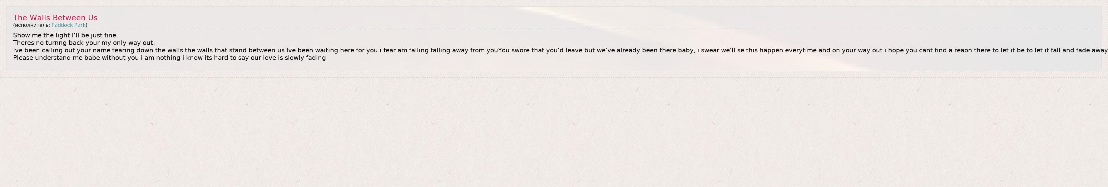 Ive been calling out your name tearing down the walls the walls that stand between us Ive been waiting here for you i fear am falling falling away from youYou swore that you'd leave but we've already been there baby, i swear we'll se this happen everytime and on your way out i hope you cant find a reaon there to let it be to let it fall and fade away