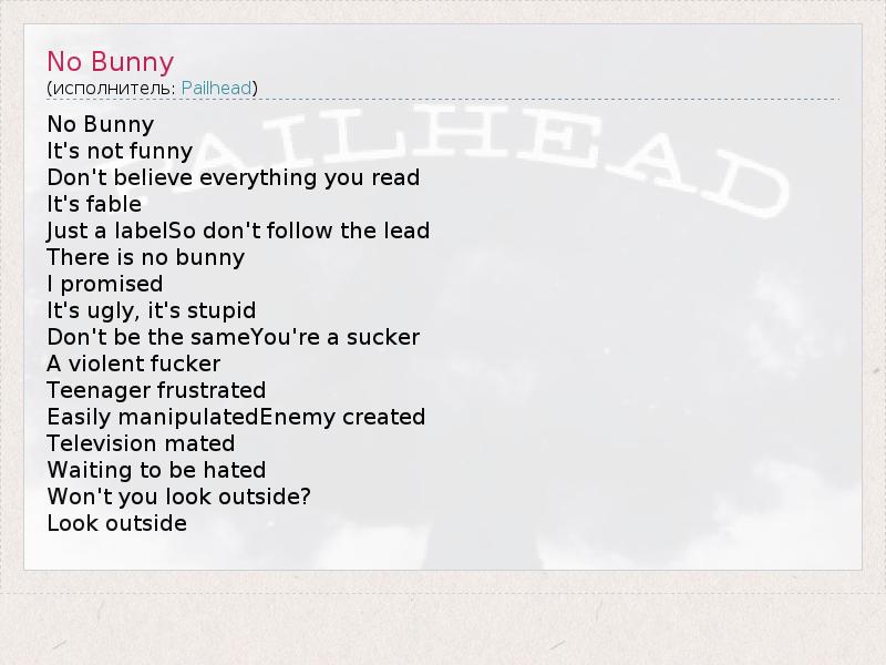 Это интересно:Pailhead - совместный проект Иан'a МакКай'я (Ian MacKaye (Minor Threat, Teen Idles, Fugazi, Embrace, и т.д.)), и Эл'a Йоргенсен'a (Al Jourgensen (Ministry + его сторонние проекты)). Группа дебютировала в 1987 с песнями “I Will Refuse” и ”No Bunny” 7”, и продолжила синглом Trait EP в 1988. (В компакт-диск были включены оба релиза.) Музыка имеет концепцию альбома Ministry "Land of Rape and Honey", где MacKaye также "вещает" нам свою политически-направленную... продолжение