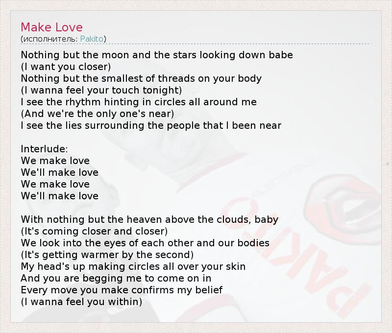 Nothing but the moon and the stars looking down babe (I want you closer) Nothing but the smallest of threads on your body (I wanna feel your touch tonight) I see the rhythm hinting in circles all around me (And we're the only one's near) I see the lies surrounding the people that I been near Interlude: We make love We'll make love We make love We'll make love With nothing but the heaven above the clouds, baby (It's coming closer and closer) We look into the eyes of each other and our bodies (It's getting warmer by the second) My head's up making circles all over your skin And you are begging me to come on in Every move you make confirms my belief (I wanna feel you within)