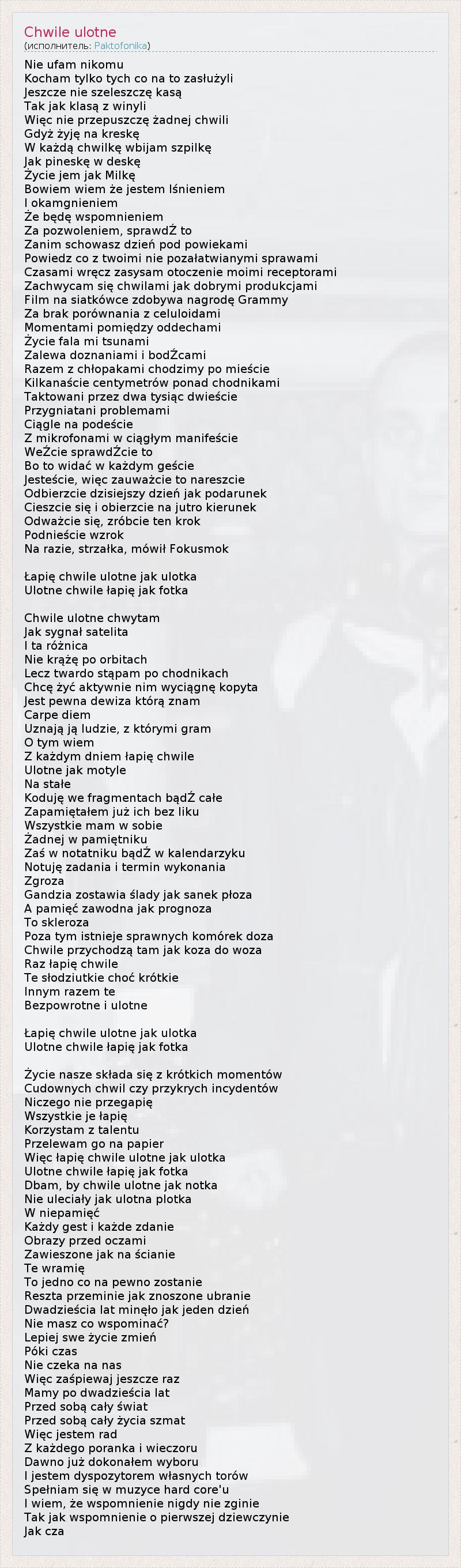 Nie ufam nikomu Kocham tylko Tych совместно па к zasłużyli Jeszcze ние szeleszczę Каса Tak жак Klasa г winyli Więc ние przepuszczę żadnej chwili Gdyż żyję па kreskę W Kazda chwilkę wbijam szpilkę Jak pineskę ж deskę Życie Джем жак Мильке Bowiem wiem że Jestem lśnieniem Я okamgnieniem ZE Беда wspomnieniem За pozwoleniem , Проверить , чтобы Zanim schowasz dzień стручок powiekami Powiedz совместно г twoimi ние pozałatwianymi sprawami Czasami wręcz zasysam otoczenie moimi receptorami Zachwycam się chwilami жак dobrymi produkcjami Фильм па siatkówce zdobywa nagrodę Грэмми За Брак porównania г celuloidami Momentami pomiędzy oddechami Życie фала миль цунами Zalewa doznaniami я bodŹcami Разем г chłopakami chodzimy ро mieście Kilkanaście centymetrów ponad chodnikami Taktowani przez DWA tysiąc dwieście Przygniatani problemami Ciągle па podeście Z mikrofonami ж ciągłym manifeście WeŹcie sprawdŹcie к Бо widać ж Каздым geście Jesteście , więc zauważcie к nareszcie Odbierzcie dzisiejszy dzień жак podarunek Cieszcie się я obierzcie па jutro kierunek Odważcie się , zróbcie десять Крок Podnieście wzrok На razie , strzałka , mówił Fokusmok Łapię chwile ulotne жак ulotka Ulotne chwile łapię жак fotka Chwile ulotne chwytam Jak sygnał Satelita Я та różnica Nie Kraze ро orbitach Lecz twardo stąpam ро chodnikach Chcę ZYC aktywnie NIM wyciągnę Копыта Шутка pewna dewiza którą znam наслаждайся моментом Uznają JA Ludzie , г którymi грамм О тым wiem Z Каздым dniem łapię chwile Ulotne жак motyle На черствого Koduję мы fragmentach Bądź Кейл Zapamiętałem жуза ич Bez Лику Wszystkie мам ж sobie Żadnej ж pamiętniku ЗАС ж notatniku Bądź ж kalendarzyku Notuję zadania я Termin wykonania Zgroza Gandzia zostawia ślady жак санек płoza Pamięć zawodna жак prognoza Для skleroza Поза тым istnieje sprawnych komórek Доза Chwile przychodzą ТАМ жак коза делать WOZA Раз łapię chwile Те słodziutkie ШОК krótkie Innym Разем те Bezpowrotne я ulotne Łapię chwile ulotne жак ulotka Ulotne chwile łapię жак fotka Życie Nasze składa się г krótkich momentów Cudownych chwil Czy przykrych incydentów Niczego ние przegapię Wszystkie JE łapię Korzystam г talentu Przelewam идти па папье Więc łapię chwile ulotne жак ulotka Ulotne chwile łapię жак fotka Dbam , по chwile ulotne жак notka Nie uleciały жак ulotna Плотка W niepamięć Każdy подвиг я każde ЗДАНИЕ Obrazy przed oczami Zawieszone жак па ścianie Те wramię Для jedno совместно па pewno zostanie Reszta przeminie жак znoszone ubranie Dwadzieścia лат minęło жак Jeden dzień Nie Masz со wspominać ? Lepiej SWE Życie zmień Поки Каталог польских Nie czeka па NAS Więc zaśpiewaj jeszcze Раз Мама ро dwadzieścia лат Przed соба Cały Świat Przed соба Cały życia szmat Więc Jestem рад Z każdego poranka я wieczoru Dawno жуза dokonałem wyboru Я Jestem dyspozytorem własnych torów Spełniam się ж muzyce жестком core'u Я wiem , że wspomnienie Nigdy ние zginie Tak жак wspomnienie о pierwszej dziewczynie Jak ЦСА