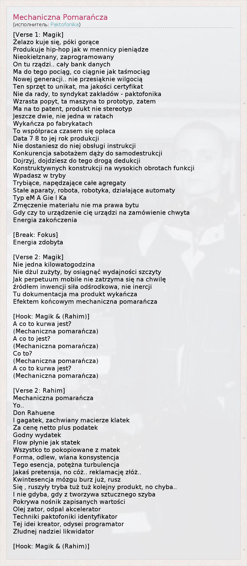 [Verse 1: Magik] Żelazo kuje się, póki gorące Produkuje hip-hop jak w mennicy pieniądze Nieokiełznany, zaprogramowany On tu rządzi.. cały bank danych Ma do tego pociąg, co ciągnie jak taśmociąg Nowej generacji.. nie przesiąknie wilgocią Ten sprzęt to unikat, ma jakości certyfikat Nie da rady, to syndykat zakładów - paktofonika Wzrasta popyt, ta maszyna to prototyp, zatem Ma na to patent, produkt nie stereotyp Jeszcze dwie, nie jedna w ratach Wykańcza po fabrykatach To współpraca czasem się opłaca Data 7 8 to jej rok produkcji Nie dostaniesz do niej obsługi instrukcji Konkurencja sabotażem dąży do samodestrukcji Dojrzyj, dojdziesz do tego drogą dedukcji Konstruktywnych konstrukcji na wysokich obrotach funkcji Wpadasz w tryby Trybiące, napędzające całe agregaty Stałe aparaty, robota, robotyka, działające automaty Typ eM A Gie I Ka Zmęczenie materiału nie ma prawa bytu Gdy czy to urządzenie cię urządzi na zamówienie chwyta Energia zakończenia [Break: Fokus] Energia zdobyta [Verse 2: Magik] Nie jedna kilowatogodzina Nie dżul zużyty, by osiągnąć wydajności szczyty Jak perpetuum mobile nie zatrzyma się na chwilę źródłem inwencji siła odśrodkowa, nie inercji Tu dokumentacja ma produkt wykańcza Efektem końcowym mechaniczna pomarańcza [Hook: Magik & (Rahim)] A co to kurwa jest? (Mechaniczna pomarańcza) A co to jest? (Mechaniczna pomarańcza) Co to? (Mechaniczna pomarańcza) A co to kurwa jest? (Mechaniczna pomarańcza) [Verse 2: Rahim] Mechaniczna pomarańcza Yo.. Don Rahuene I gagatek, zachwiany macierze klatek Za cenę netto plus podatek Godny wydatek Flow płynie jak statek Wszystko to pokopiowane z matek Forma, odlew, wlana konsystencja Tego esencja, potężna turbulencja Jakaś pretensja, no cóż.. reklamację złóż.. Kwintesencja mózgu burz już, rusz Się , ruszyły tryba tuż tuż kolejny produkt, no chyba.. I nie gdyba, gdy z tworzywa sztucznego szyba Pokrywa nośnik zapisanych wartości Olej zator, odpal akcelerator Techniki paktofoniki identyfikator Tej idei kreator, odysei programator Złudnej nadziei likwidator [Hook: Magik & (Rahim)]